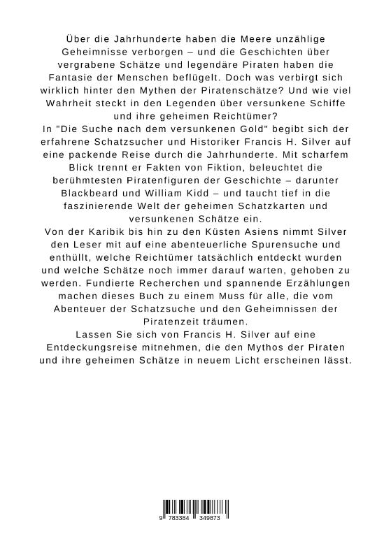 Über die Jahrhunderte haben die Meere unzählige Geheimnisse verborgen - und die Geschichten über vergrabene Schätze und legendäre Piraten haben die Fantasie der Menschen beflügelt. Doch was verbirgt sich wirklich hinter den Mythen der Piratenschätze? Und wie viel Wahrheit steckt in den Legenden über versunkene Schiffe und ihre geheimen Reichtümer?In "Die Suche nach dem versunkenen Gold" begibt sich der erfahrene Schatzsucher und Historiker Francis H. Silver auf eine packende Reise durch die Jahrhunderte. Mit scharfem Blick trennt er Fakten von Fiktion, beleuchtet die berühmtesten Piratenfiguren der Geschichte - darunter Blackbeard und William Kidd - und taucht tief in die faszinierende Welt der geheimen Schatzkarten und versunkenen Schätze ein.Von der Karibik bis hin zu den Küsten Asiens nimmt Silver den Leser mit auf eine abenteuerliche Spurensuche und enthüllt, welche Reichtümer tatsächlich entdeckt wurden und welche Schätze noch immer darauf warten, gehoben zu werden. Fundierte Recherchen und spannende Erzählungen machen dieses Buch zu einem Muss für alle, die vom Abenteuer der Schatzsuche und den Geheimnissen der Piratenzeit träumen.Lassen Sie sich von Francis H. Silver auf eine Entdeckungsreise mitnehmen, die den Mythos der Piraten und ihre geheimen Schätze in neuem Licht erscheinen lässt.