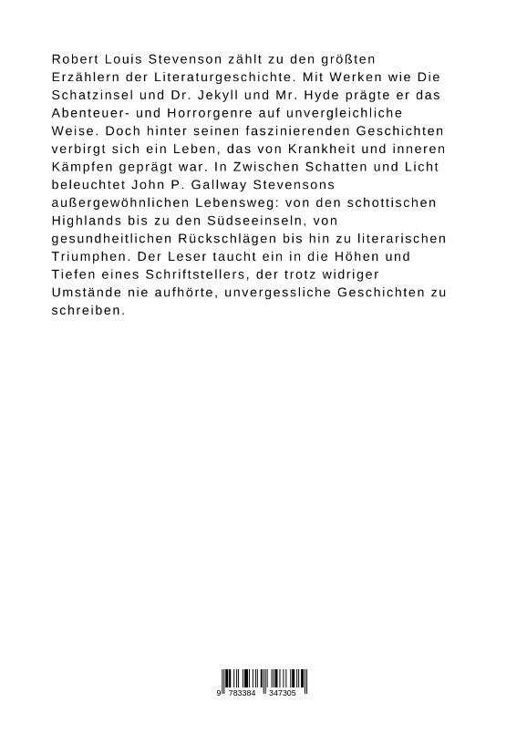 Robert Louis Stevenson zählt zu den größten Erzählern der Literaturgeschichte. Mit Werken wie Die Schatzinsel und Dr. Jekyll und Mr. Hyde prägte er das Abenteuer- und Horrorgenre auf unvergleichliche Weise. Doch hinter seinen faszinierenden Geschichten verbirgt sich ein Leben, das von Krankheit und inneren Kämpfen geprägt war. In Zwischen Schatten und Licht beleuchtet John P. Gallway Stevensons außergewöhnlichen Lebensweg: von den schottischen Highlands bis zu den Südseeinseln, von gesundheitlichen Rückschlägen bis hin zu literarischen Triumphen. Der Leser taucht ein in die Höhen und Tiefen eines Schriftstellers, der trotz widriger Umstände nie aufhörte, unvergessliche Geschichten zu schreiben.