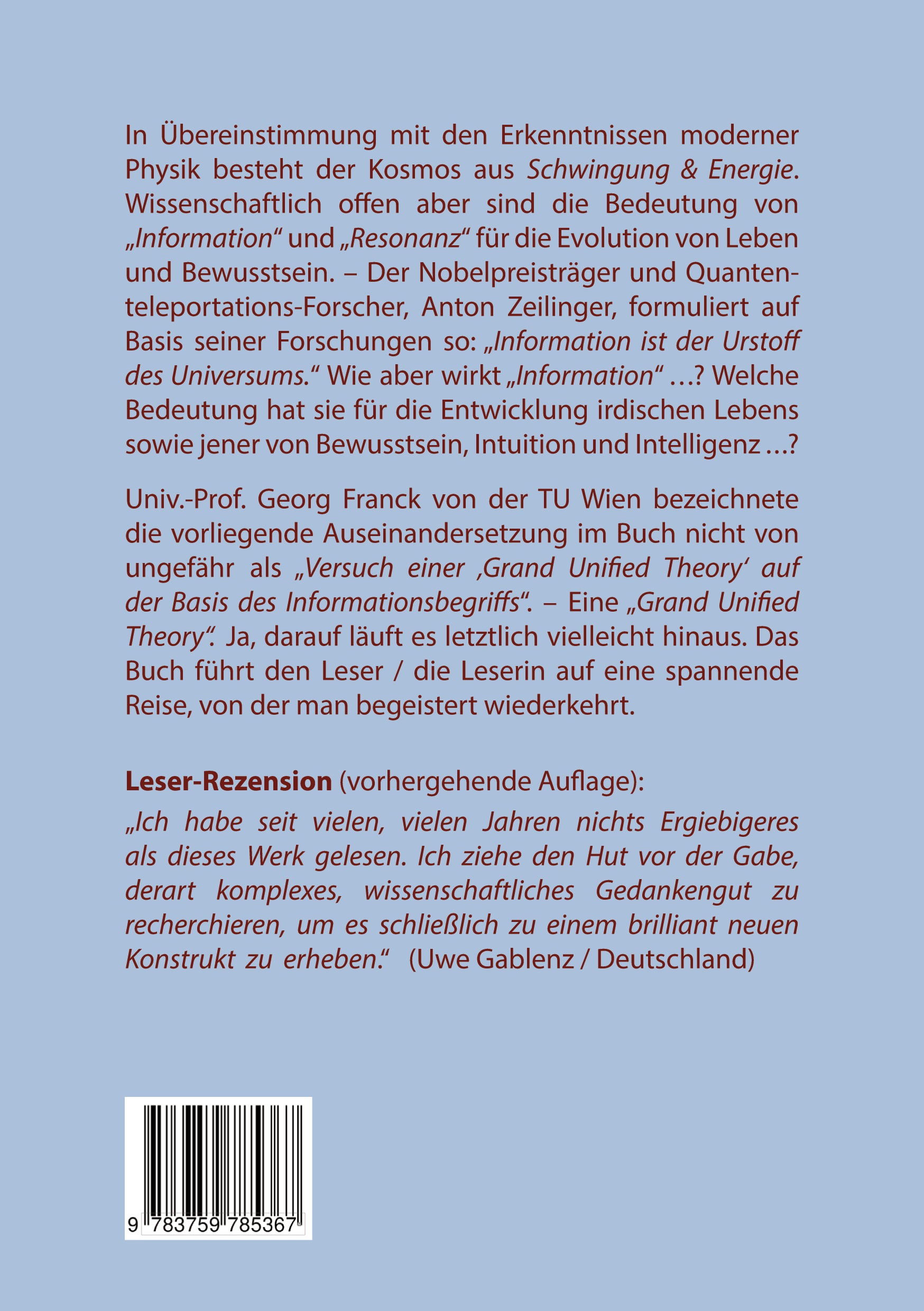 Univ.-Prof. Georg Franck von der TU Wien bezeichnete die vorliegende Auseinandersetzung im Buch nicht von ungefähr als "Versuch einer 'Grand Unified Theory' auf der Basis des Informationsbegriffs". - Eine "Grand Unified Theory". Ja, darauf läuft es letztlich vielleicht hinaus.