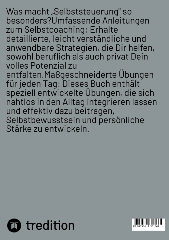 Was macht "Selbststeuerung" so besonders?Umfassende Anleitungen zum Selbstcoaching: Erhalte detaillierte, leicht verständliche und anwendbare Strategien, die Dir helfen, sowohl beruflich als auch privat Dein volles Potenzial zu entfalten.Maßgeschneiderte Übungen für jeden Tag: Dieses Buch enthält speziell entwickelte Übungen, die sich nahtlos in den Alltag integrieren lassen und effektiv dazu beitragen, Selbstbewusstsein und persönliche Stärke zu entwickeln.