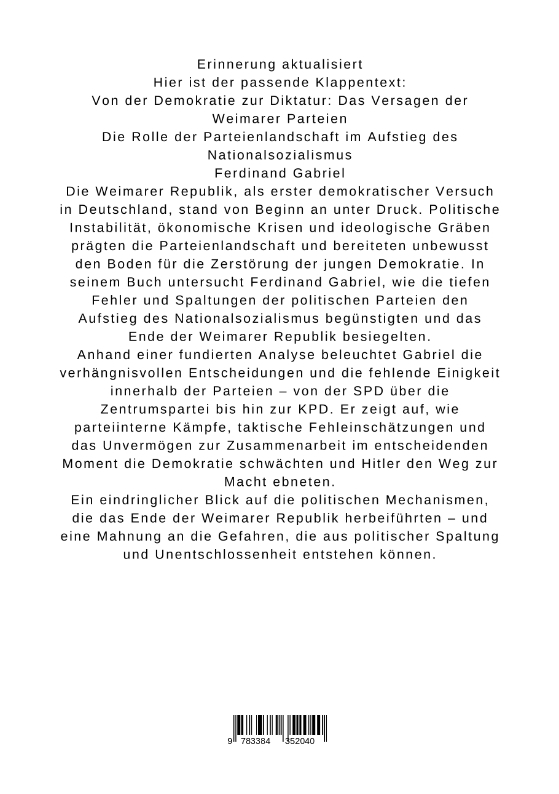 Die Weimarer Republik, als erster demokratischer Versuch in Deutschland, stand von Beginn an unter Druck. Politische Instabilität, ökonomische Krisen und ideologische Gräben prägten die Parteienlandschaft und bereiteten unbewusst den Boden für die Zerstörung der jungen Demokratie. In seinem Buch untersucht Ferdinand Gabriel, wie die tiefen Fehler und Spaltungen der politischen Parteien den Aufstieg des Nationalsozialismus begünstigten und das Ende der Weimarer Republik besiegelten.Anhand einer fundierten Analyse beleuchtet Gabriel die verhängnisvollen Entscheidungen und die fehlende Einigkeit innerhalb der Parteien - von der SPD über die Zentrumspartei bis hin zur KPD. Er zeigt auf, wie parteiinterne Kämpfe, taktische Fehleinschätzungen und das Unvermögen zur Zusammenarbeit im entscheidenden Moment die Demokratie schwächten und Hitler den Weg zur Macht ebneten.Ein eindringlicher Blick auf die politischen Mechanismen, die das Ende der Weimarer Republik herbeiführten - und eine Mahnung an die Gefahren, die aus politischer Spaltung und Unentschlossenheit entstehen können.