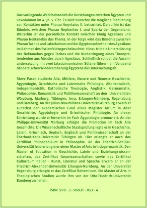 Das vorliegende Werk behandelt die Beziehungen zwischen Ägypten und Lakedaimon im 4. Jh. v. Chr. Es wird zunächst die mögliche Etablierung von Kontakten unter Pharao Amyrtaios II. betrachtet. Daraufhin ist das Bündnis zwischen Pharao Nepherites I. und Sparta der Gegenstand. Weiterhin ist der persönliche Kontakt zwischen König Agesilaos und Pharao Nektanebis das Thema. In der Folge wird das Bündnis zwischen Pharao Tachos und Lakedaimon und der Ägyptenaufenthalt des Agesilaos im Rahmen des Syrienfeldzuges beleuchtet. Hinzu tritt die Unterstützung des Nektanebos gegen Tachos und die Niederringung eines Thronprätendenten aus Mendes durch Agesilaos. Schließlich rundet die Auseinandersetzung mit zwei lakedaimonischen Söldnerführern am Vorabend der persischen Wiedereroberung Ägyptens die Untersuchung ab.