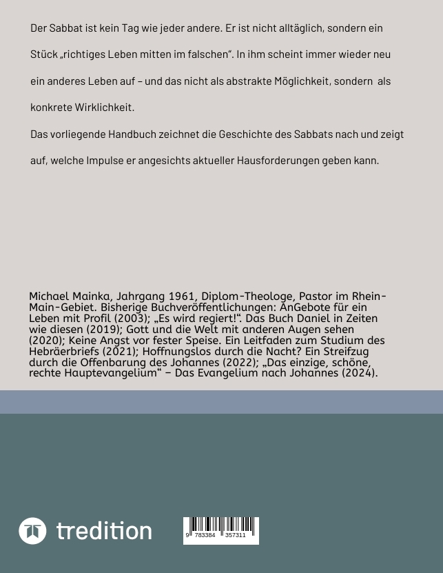 Der Sabbat ist immer wieder neu entdeckt und entfaltet worden - bereits in biblischen Zeiten. Das vorliegende Handbuch zeichnet die Geschichte des Sabbats bis in unsere heutige Zeit nach und zeigt auf, welche Impulse er angesichts aktueller Hausforderungen geben kann. Es enthält und kommentiert alle einschlägigen Texte. Daher kann man es auch als eine Art Nachschlagewerk nutzen. Wer es aber von Anfang bis Ende durcharbeitet, wird so sein Gespür dafür schärfen, wie die Botschaft des Sabbats immer wieder neu wirksam geworden ist und welche Bedeutung sie in unserer heutigen Zeit hat.