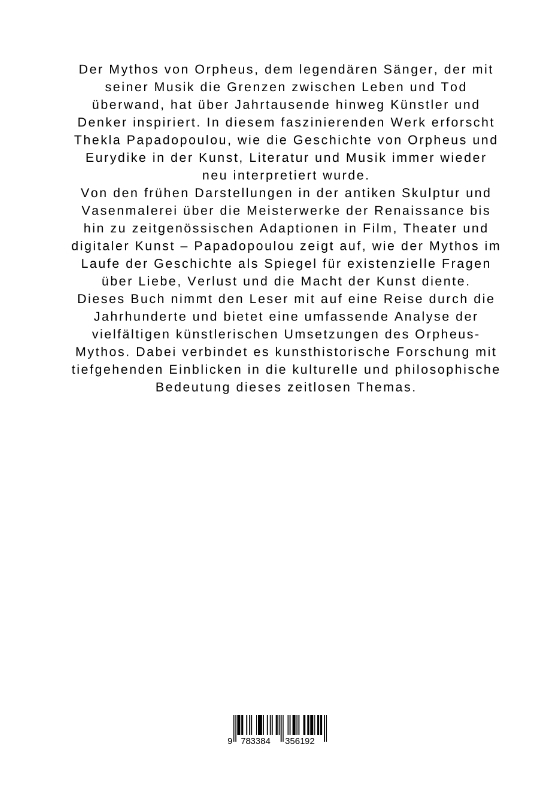 Der Mythos von Orpheus, dem legendären Sänger, der mit seiner Musik die Grenzen zwischen Leben und Tod überwand, hat über Jahrtausende hinweg Künstler und Denker inspiriert. In diesem faszinierenden Werk erforscht Thekla Papadopoulou, wie die Geschichte von Orpheus und Eurydike in der Kunst, Literatur und Musik immer wieder neu interpretiert wurde.Von den frühen Darstellungen in der antiken Skulptur und Vasenmalerei über die Meisterwerke der Renaissance bis hin zu zeitgenössischen Adaptionen in Film, Theater und digitaler Kunst - Papadopoulou zeigt auf, wie der Mythos im Laufe der Geschichte als Spiegel für existenzielle Fragen über Liebe, Verlust und die Macht der Kunst diente.Dieses Buch nimmt den Leser mit auf eine Reise durch die Jahrhunderte und bietet eine umfassende Analyse der vielfältigen künstlerischen Umsetzungen des Orpheus-Mythos. Dabei verbindet es kunsthistorische Forschung mit tiefgehenden Einblicken in die kulturelle und philosophische Bedeutung dieses zeitlosen Themas.