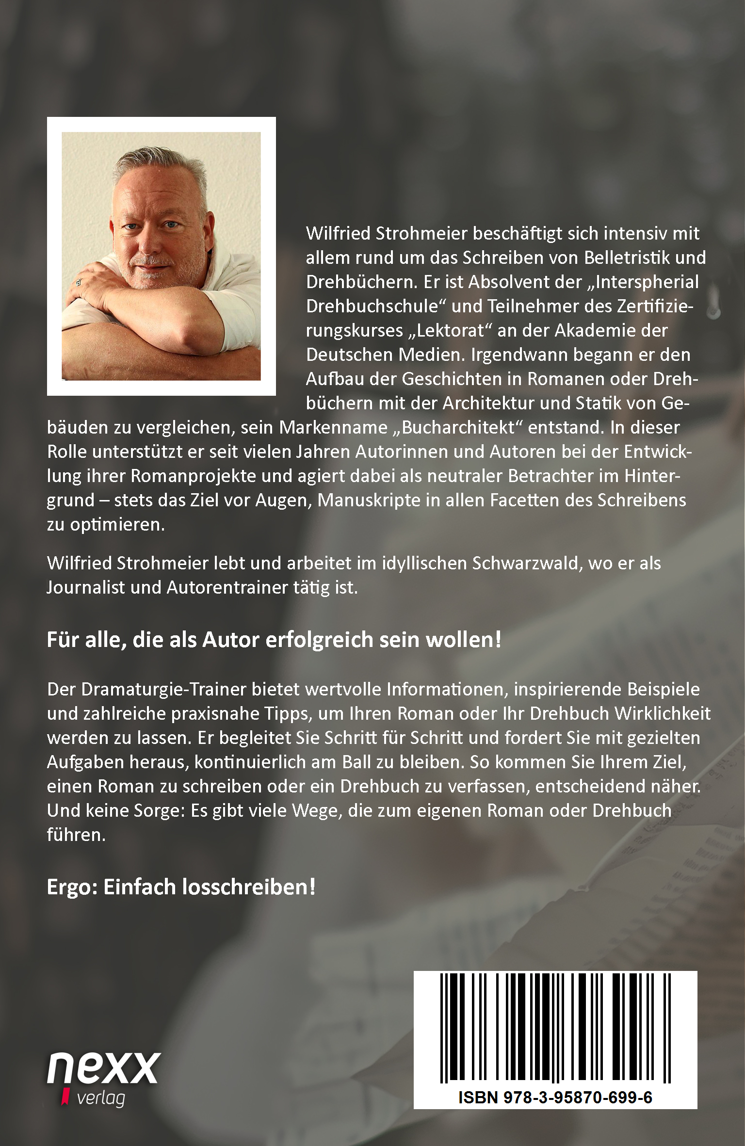 Wilfried Strohmeier beschäftigt sich intensiv mit allem rund um das Schreiben von Belletristik und Drehbüchern. Er ist Absolvent der „Interspherial Drehbuchschule“ und Teilnehmer des Zertifizierungskurses „Lektorat“ an der Akademie der Deutschen Medien. Irgendwann begann er den Aufbau der Geschichten in Romanen oder Drehbüchern mit der Architektur und Statik von Gebäuden zu vergleichen, sein Markenname „Bucharchitekt“ entstand. In dieser Rolle unterstützt er seit vielen Jahren Autorinnen und Autoren bei der Entwicklung ihrer Romanprojekte und agiert dabei als neutraler Betrachter im Hintergrund – stets das Ziel vor Augen, Manuskripte in allen Facetten des Schreibens zu optimieren. Wilfried Strohmeier lebt und arbeitet im idyllischen Schwarzwald, wo er als Journalist und Autorentrainer tätig ist.