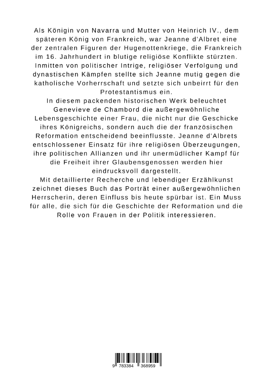 Als Königin von Navarra und Mutter von Heinrich IV., dem späteren König von Frankreich, war Jeanne d'Albret eine der zentralen Figuren der Hugenottenkriege, die Frankreich im 16. Jahrhundert in blutige religiöse Konflikte stürzten. Inmitten von politischer Intrige, religiöser Verfolgung und dynastischen Kämpfen stellte sich Jeanne mutig gegen die katholische Vorherrschaft und setzte sich unbeirrt für den Protestantismus ein.In diesem packenden historischen Werk beleuchtet Genevieve de Chambord die außergewöhnliche Lebensgeschichte einer Frau, die nicht nur die Geschicke ihres Königreichs, sondern auch die der französischen Reformation entscheidend beeinflusste. Jeanne d'Albrets entschlossener Einsatz für ihre religiösen Überzeugungen, ihre politischen Allianzen und ihr unermüdlicher Kampf für die Freiheit ihrer Glaubensgenossen werden hier eindrucksvoll dargestellt.Mit detaillierter Recherche und lebendiger Erzählkunst zeichnet dieses Buch das Porträt einer außergewöhnlichen Herrscherin, deren Einfluss bis heute spürbar ist. Ein Muss für alle, die sich für die Geschichte der Reformation und die Rolle von Frauen in der Politik interessieren.