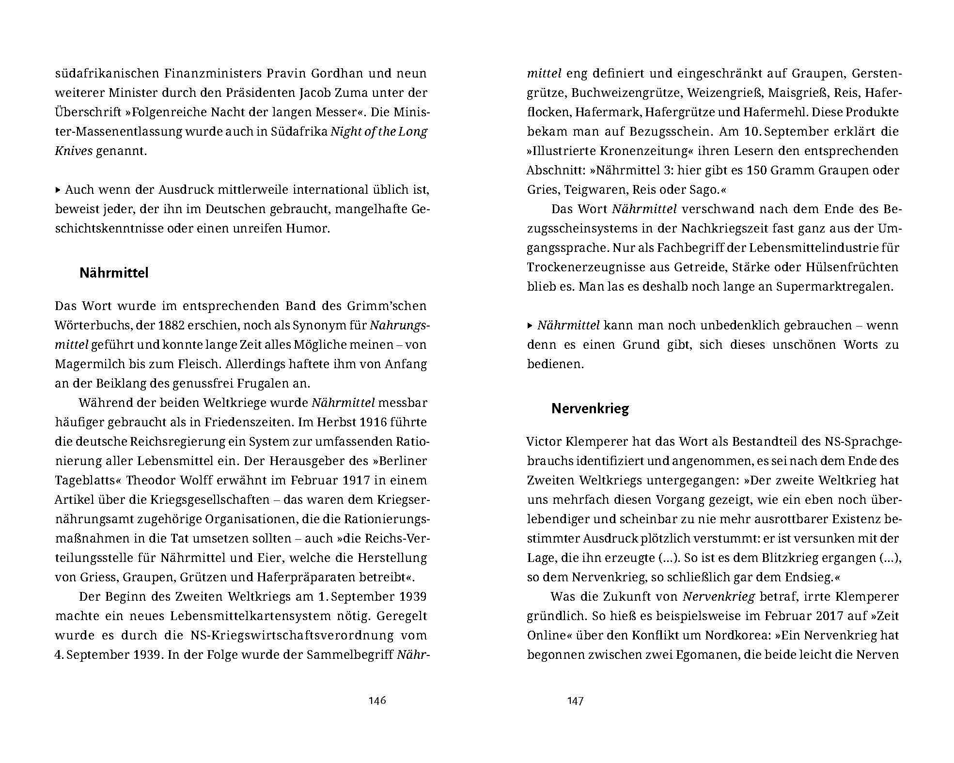 Oft stehen Ausdrücke zu Unrecht unter Naziverdacht. Bei anderen ganz alltäglichen und unpolitischen Wörtern dagegen ist ihr Ursprung in der NS-Zeit längst in Vergessenheit geraten. Es geht nicht darum, eine Fahndungsliste für irgendeine Sprachpolizei zu erstellen. Sondern es geht darum zu vermitteln, was die Grundlagen jeder angemessenen Ausdrucksweise sind: Sensibilität, Kenntnis der Stilebenen, Sinn für Angemessenheit und – ja – auch das Wissen um die Geschichte von Wörtern.