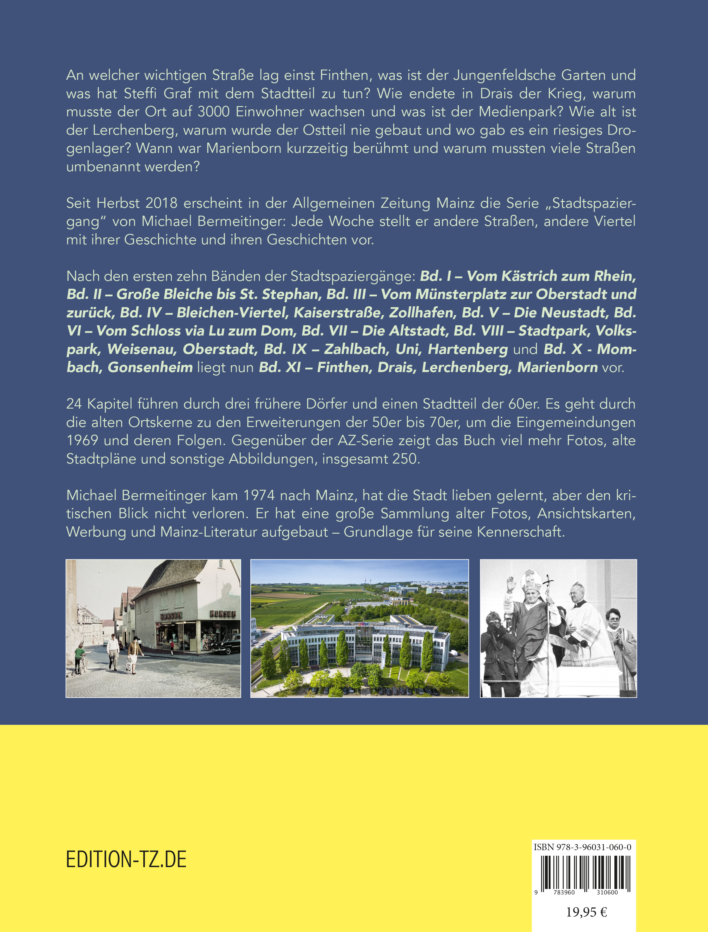 Michael Bermeitinger wurde 1960 in Lörrach/Baden geboren, wuchs in Bonn auf und lebt seit 1974 in Mainz. Seit 1988 Redakteur der Allgemeinen Zeitung, ist er ab 2012 in der Lokalredaktion Mainz tätig, für die Bermeitinger unter anderem über die jüngere Geschichte der Stadt Mainz schreibt. Themen sind hierbei nicht die großen historischen Linien, sondern der Alltag der Menschen, die städtebauliche, architektonische und verkehrliche Entwicklung der Stadt. Im Magazin „Unsere Geschichte“ der VRM beleuchtete er in einzelnen Ausgaben unter anderem die 30er, 50er, 60er und 70er Jahre in Mainz. In den letzten Jahren hat Bermeitinger eine umfangreiche Sammlung tausender alter Fotos und Ansichtskarten aufgebaut, die ergänzt wird durch Dokumente, die von Kofferaufklebern, Firmenbriefen und Speisekarten über Straßenbahnfahrpläne, alte Werbung und Lebensmittelkarten bis hin zu Fahrkarten und Fastnachtsprogrammen reicht. Quelle sind in aller Regel Internetauktionshäuser wie Ebay, aber auch der Johannis-Büchermarkt oder die Bücherstände beim Zitadellenfest. Die Idee zu den Stadtspaziergängen ist über Jahre gewachsen. Der Gedanke dabei war, dass Geschichte und Geschichten nicht immer nur ereignisbezogen zu Jahrestagen erzählt werden sollten, sondern aus der Perspektive des Alltags und der Stadtviertel. Was lag also näher, als Straße für Straße durch die Stadt zu spazieren und von all den großen und kleinen Ereignisse zu erzählen, von den besten Zeiten wie auch den dunklen Jahren. Mainz kann so schön sein, aber es hat auch Ecken, die wie eine einzige Narbe wirken. Zu verstehen, warum das so ist - dabei sollen die Stadtspaziergänge helfen, die seit September 2018 mit kurzen Unterbrechungen immer montags in der AZ erscheinen.