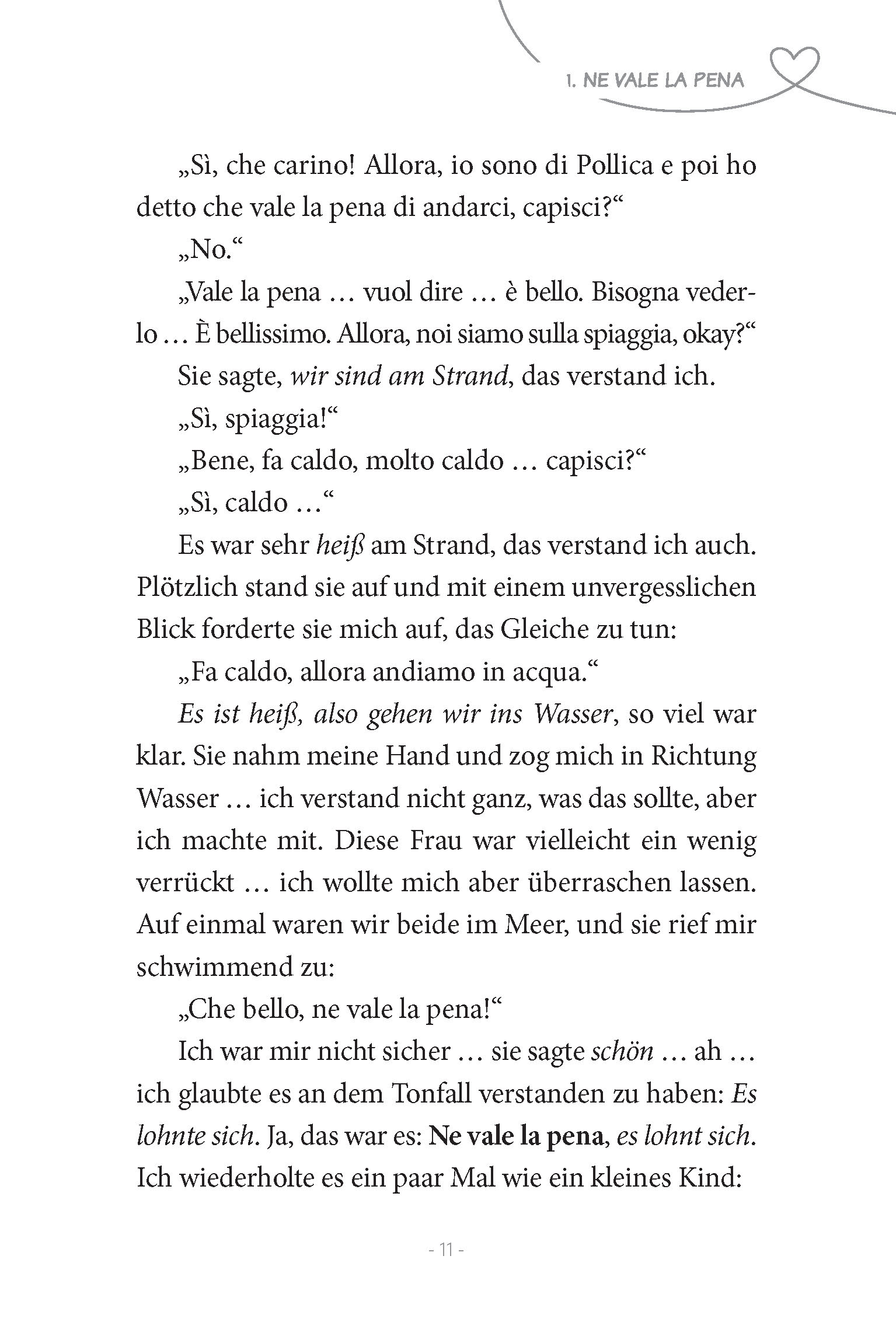 Die zweisprachige Geschichte vermittelt Ihnen die Sprache ganz natürlich und unkompliziert. Deutsche Erzählpassagen wechseln mit italienischen Dialogen, die im Laufe der Geschichte zunehmen. Begleiten Sie Nico bei seinem Urlaub in Italien und lernen Sie mit ihm Francesca und die italienische Sprache kennen und lieben. Lesen Sie los!
