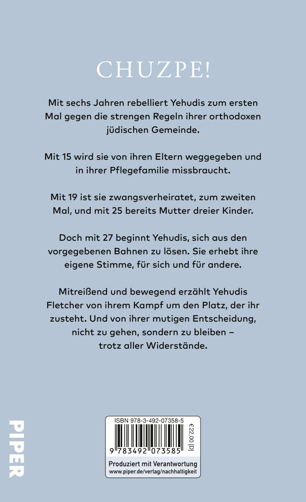 | Schlagworte | Bericht/Erinnerung • Biografie • Charedi • Coming of Age • eine von euch • Emanzipation • Frau im Judentum • Freiheit • Glaube • Identität • Judentum • Jüdin • Jüdische Biografie • Jüdische Gemeinde • Jüdische Identität • Jüdisches Leben • keine von euch • lesbische Jüdin • lesbisches Judentum • Memoir • Orthodoxes Judentum • Religiöser Extremismus • Sexuelle Identität • Starke Frau • Unorthodox • Wahre GEschichte |