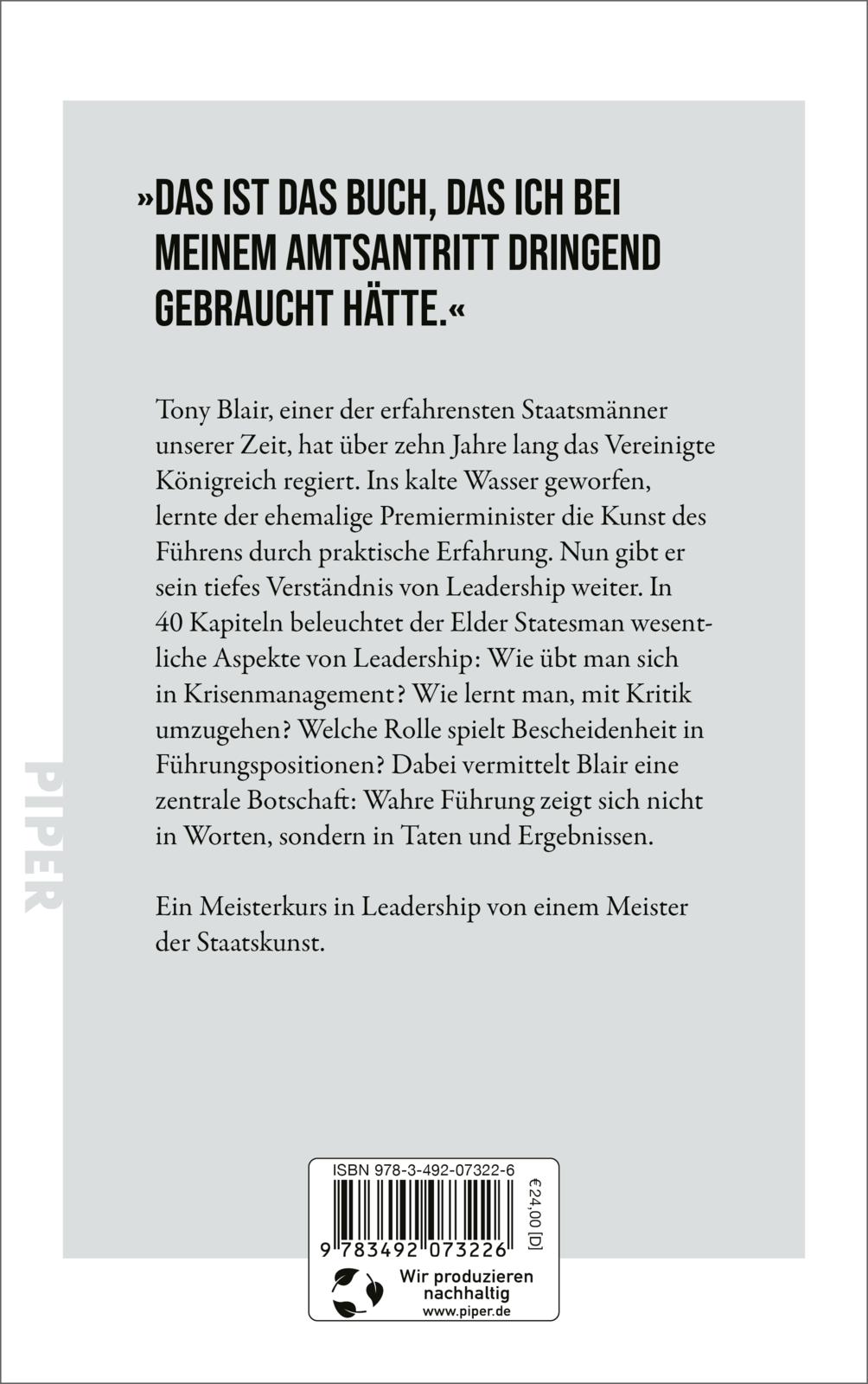 In 40 kompakten Kapiteln behandelt Blair essenzielle Fragen zu Führungskompetenzen, Krisenmanagement, der Bedeutung von KI, Umgang mit Kritik und der Bedeutung von Bescheidenheit. Er vermittelt dabei eine zentrale Botschaft: Effektive Führung misst sich nicht an Worten, sondern an Taten und Ergebnissen.