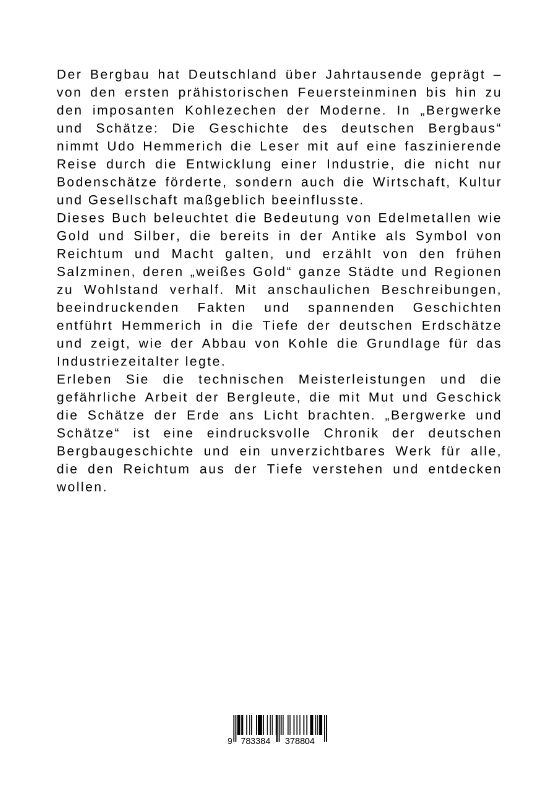 Der Bergbau hat Deutschland über Jahrtausende geprägt - von den ersten prähistorischen Feuersteinminen bis hin zu den imposanten Kohlezechen der Moderne. In "Bergwerke und Schätze: Die Geschichte des deutschen Bergbaus" nimmt Udo Hemmerich die Leser mit auf eine faszinierende Reise durch die Entwicklung einer Industrie, die nicht nur Bodenschätze förderte, sondern auch die Wirtschaft, Kultur und Gesellschaft maßgeblich beeinflusste.Dieses Buch beleuchtet die Bedeutung von Edelmetallen wie Gold und Silber, die bereits in der Antike als Symbol von Reichtum und Macht galten, und erzählt von den frühen Salzminen, deren "weißes Gold" ganze Städte und Regionen zu Wohlstand verhalf. Mit anschaulichen Beschreibungen, beeindruckenden Fakten und spannenden Geschichten entführt Hemmerich in die Tiefe der deutschen Erdschätze und zeigt, wie der Abbau von Kohle die Grundlage für das Industriezeitalter legte.Erleben Sie die technischen Meisterleistungen und die gefährliche Arbeit der Bergleute, die mit Mut und Geschick die Schätze der Erde ans Licht brachten. "Bergwerke und Schätze" ist eine eindrucksvolle Chronik der deutschen Bergbaugeschichte und ein unverzichtbares Werk für alle, die den Reichtum aus der Tiefe verstehen und entdecken wollen.