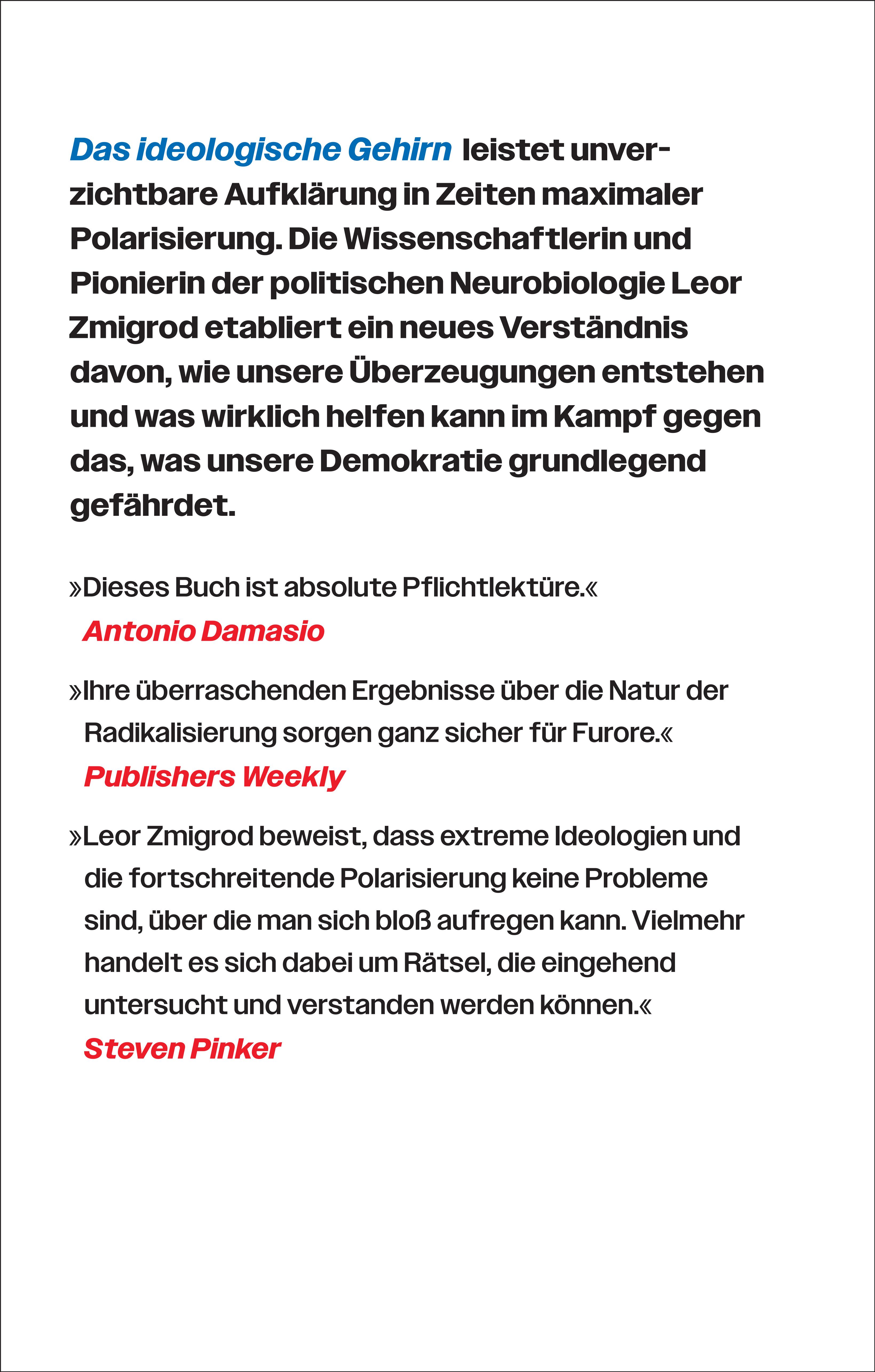 Das ideologische Gehirn leistet unverzichtbare Aufklärung in Zeiten maximaler Polarisierung. Die Wissenschaftlerin und Pionierin der politischen Neurobiologie Leor Zmigrod etabliert ein neues Verständnis davon, wie unsere Überzeugungen entstehen und was wirklich helfen kann im Kampf gegen das, was unsere Demokratie grundlegend gefährdet.