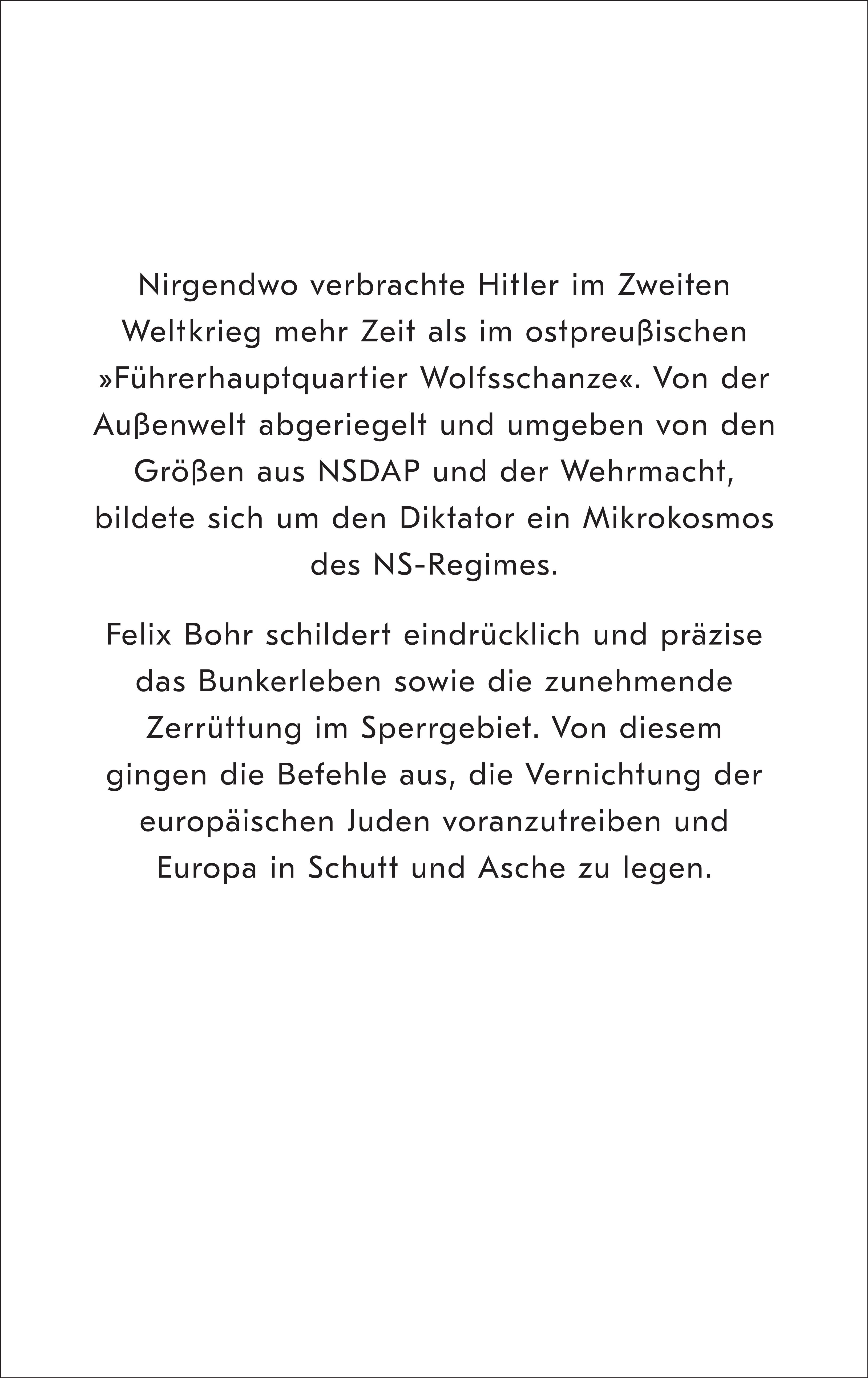 Auf der Basis von Zeitzeugnissen und bislang unveröffentlichten Dokumenten rekonstruiert Felix Bohr den Alltag in der »Wolfsschanze«. Seine Schilderungen verknüpft er mit grundlegenden Fragen: Was erfährt man aus den Berichten von Offizieren, Köchinnen und Kammerdienern über Hitlers Persönlichkeit? Wie beeinflussten die zunehmend chaotischen Verhältnisse und die paranoide Atmosphäre in dem abgelegenen Komplex die dort getroffenen Entscheidungen? Aus Bohrs dichten Beschreibungen ergibt sich eine präzise Analyse der obersten Ebene des NS-Regimes, die zwischen Teestunden und Waldspaziergängen das deutsche Menschheitsverbrechen plante.