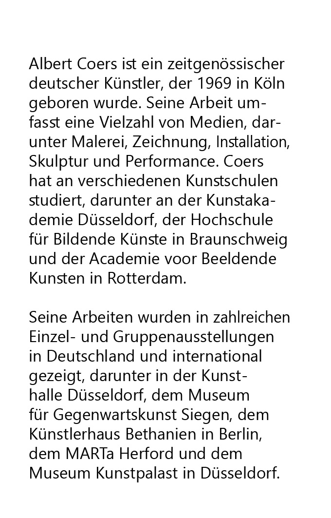 2023 stellte Albert Coers dem künstlichen Gesprächspartner ChatGPT die Frage: „Wer ist Albert Coers?“, in verschiedenen Sprachen und unter Angabe unterschiedlicher Tätigkeitsfelder. Die Antworten sind verblüffend weit von der „Wahrheit“ entfernt, dabei plausibel, immer anders, eröffnen statt biographischer Fakten alternative Lebensläufe: Neben abweichenden Geburtsorten (u.a. Köln, Düsseldorf und -jahren sind genannt Akademien, an denen Coers nie studiert, Stipendien, Preise, Residenzen, die er nie erhalten, Institutionen, an denen er nie ausgestellt, Bücher, die er nie veröffentlicht hat …