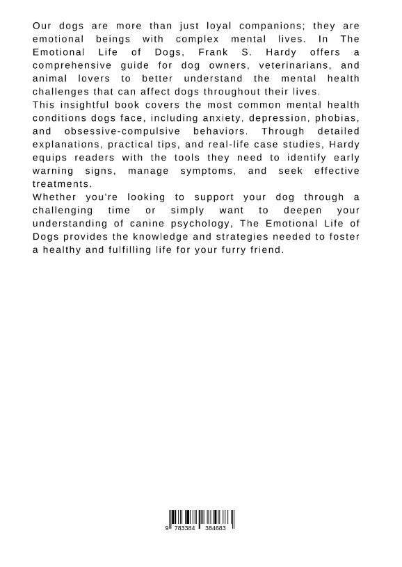 Our dogs are more than just loyal companions; they are emotional beings with complex mental lives. In The Emotional Life of Dogs, Frank S. Hardy offers a comprehensive guide for dog owners, veterinarians, and animal lovers to better understand the mental health challenges that can affect dogs throughout their lives.This insightful book covers the most common mental health conditions dogs face, including anxiety, depression, phobias, and obsessive-compulsive behaviors. Through detailed explanations, practical tips, and real-life case studies, Hardy equips readers with the tools they need to identify early warning signs, manage symptoms, and seek effective treatments.Whether you're looking to support your dog through a challenging time or simply want to deepen your understanding of canine psychology, The Emotional Life of Dogs provides the knowledge and strategies needed to foster a healthy and fulfilling life for your furry friend.