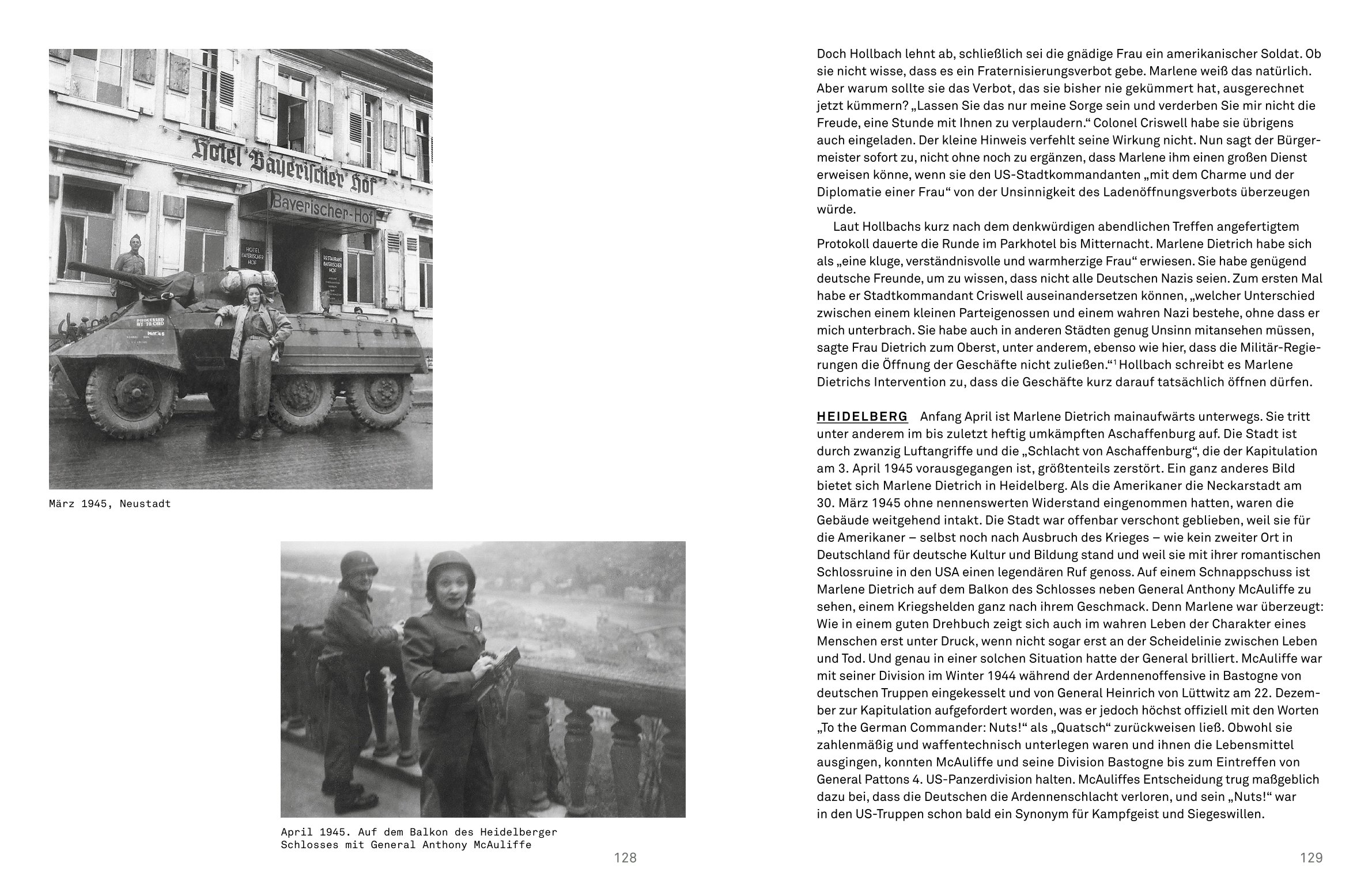 Die Hollywood-Ikone Marlene Dietrich in einem ihrer beeindruckendsten Einsätze: F.A.Z.-Journalist Reiner Burger erzählt die bisher wenig bekannte Geschichte von Dietrichs mutigem Engagement gegen die Nazis und für die Freiheit. Er rekonstruiert ihre Auftritte von den europäischen Kriegsschauplätzen bis hin zu ihrer unermüdlichen Arbeit in der amerikanischen Heimat. Ein Höhepunkt: Am 29. November 1944 steht sie auf der Bühne der Schauburg im gerade erst befreiten Stolberg und begeistert amerikanische Soldaten – mitten im Krieg, furchtlos und unerschrocken. Dietrich, die aus Protest gegen das NS-Regime ihre deutsche Staatsbürgerschaft abgelegt hatte, zeigt hier ihre unverbrüchliche Haltung.