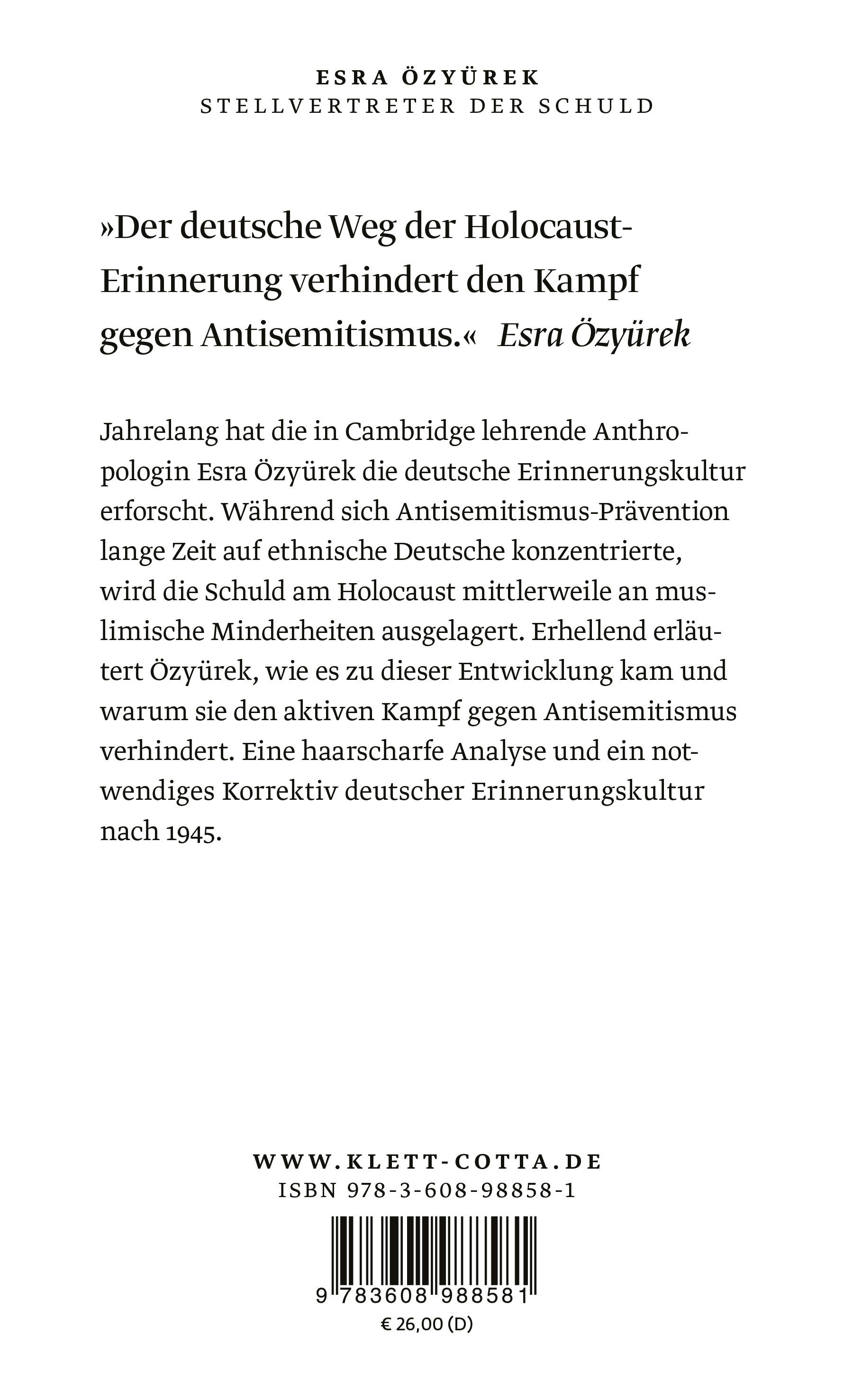 Jahrelang hat die in Cambridge lehrende Anthropologin Esra Özyürek die deutsche Erinnerungskultur erforscht. Während sich Antisemitismus-Prävention lange Zeit auf ethnische Deutsche konzentrierte, wird die Schuld am Holocaust mittlerweile an muslimische Minderheiten ausgelagert. »Stellvertreter der Schuld« erläutert, wie es zu dieser Entwicklung kam und warum sie den aktiven Kampf gegen Antisemitismus verhindert.
