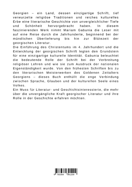 Georgien - ein Land, dessen einzigartige Schrift, tief verwurzelte religiöse Traditionen und reiches kulturelles Erbe eine literarische Geschichte von unvergleichlicher Tiefe und Schönheit hervorgebracht haben. In diesem faszinierenden Werk nimmt Mariam Gabunia die Leser mit auf eine Reise durch die Jahrhunderte, beginnend bei der mündlichen Überlieferung bis hin zur Blütezeit der georgischen Literatur.Die Einführung des Christentums im 4. Jahrhundert und die Entwicklung der georgischen Schrift legten den Grundstein für eine einzigartige kulturelle Identität. Gabunia beleuchtet die bedeutende Rolle der Schrift bei der Verbreitung religiöser Lehren und wie sie zum Ausdruck der nationalen Eigenständigkeit wurde. Von den frühesten Schriften bis zu den literarischen Meisterwerken des Goldenen Zeitalters Georgiens - dieses Buch enthüllt die enge Verbindung zwischen Sprache, Glauben und der kulturellen Seele eines Volkes.Ein Muss für Literatur- und Geschichtsinteressierte, die mehr über die unvergängliche Kraft georgischer Literatur und ihre Rolle in der Geschichte erfahren möchten.