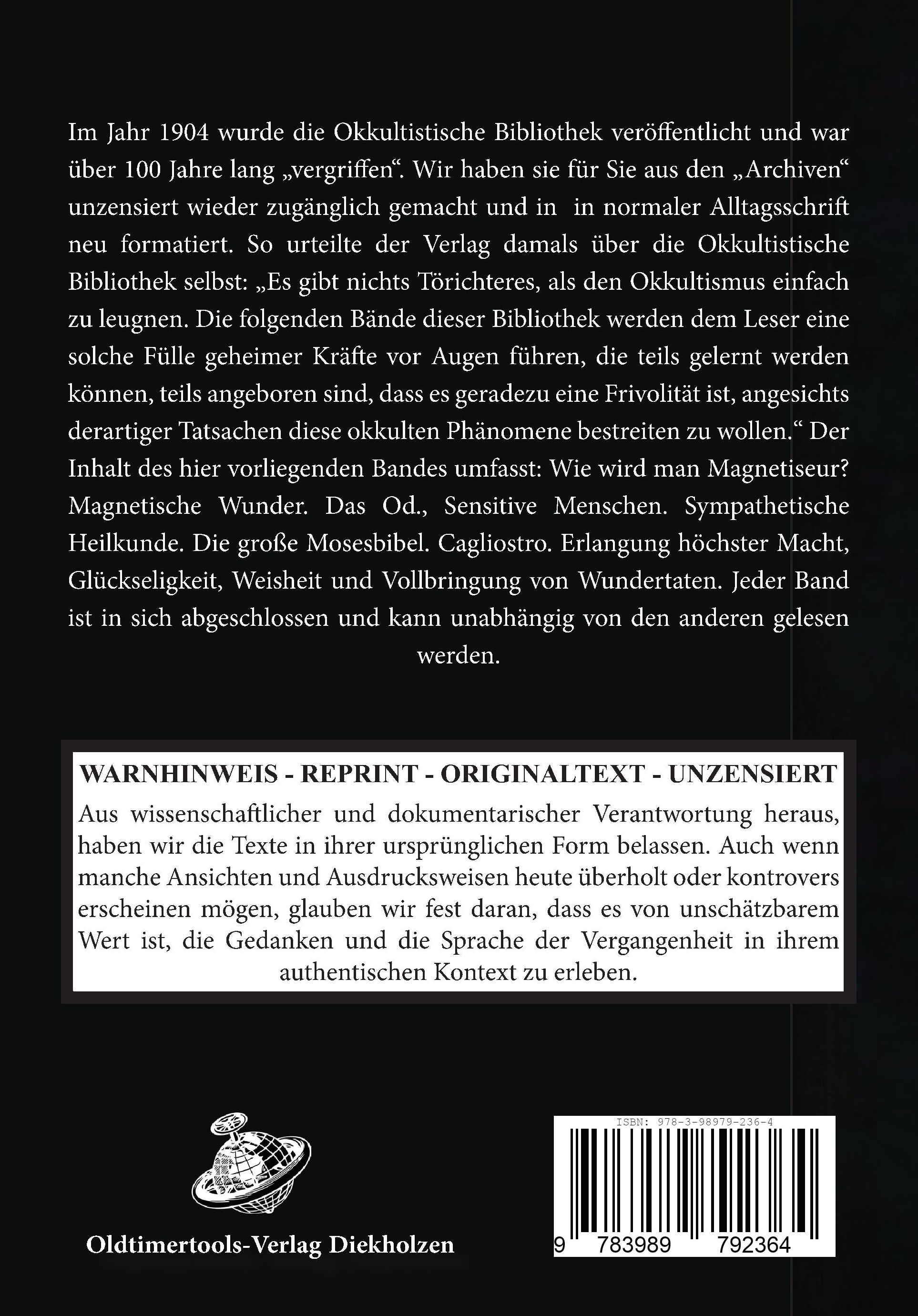 Im Jahr 1904 wurde die Okkultistische Bibliothek veröffentlicht und war über 100 Jahre lang "vergriffen". Wir haben sie für Sie aus den "Archiven" unzensiert wieder zugänglich gemacht und in Normalschrift neu gesetzt. So urteilte der Verlag damals über die Okkultistische Bibliothek selbst: "Es gibt nichts Törichteres, als den Okkultismus einfach zu leugnen. Die folgenden Bände dieser Bibliothek werden dem Leser eine solche Fülle geheimer Kräfte vor Augen führen, die teils gelernt werden können, teils angeboren sind, dass es geradezu eine Frivolität ist, angesichts derartiger Tatsachen diese okkulten Phänomene bestreiten zu wollen." Der Inhalt des hier vorliegenden Bandes umfasst: Magnetismus, Wie wird man Magnetiseur? Magnetische Wunder. Das Od., Sensitive Menschen. Sympathetische Heilkunde. Die große Mosesbibel. Cagliostro. Erlangung höchster Macht, Glückseligkeit, Weisheit und Vollbringung von Wundertaten. Jeder Band ist in sich abgeschlossen und kann unabhängig von den anderen gelesen werden.
