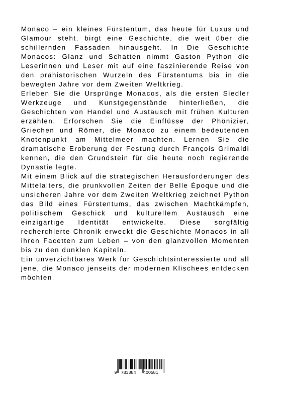 Monaco - ein kleines Fürstentum, das heute für Luxus und Glamour steht, birgt eine Geschichte, die weit über die schillernden Fassaden hinausgeht. In Die Geschichte Monacos: Glanz und Schatten nimmt Gaston Python die Leserinnen und Leser mit auf eine faszinierende Reise von den prähistorischen Wurzeln des Fürstentums bis in die bewegten Jahre vor dem Zweiten Weltkrieg.Erleben Sie die Ursprünge Monacos, als die ersten Siedler Werkzeuge und Kunstgegenstände hinterließen, die Geschichten von Handel und Austausch mit frühen Kulturen erzählen. Erforschen Sie die Einflüsse der Phönizier, Griechen und Römer, die Monaco zu einem bedeutenden Knotenpunkt am Mittelmeer machten. Lernen Sie die dramatische Eroberung der Festung durch François Grimaldi kennen, die den Grundstein für die heute noch regierende Dynastie legte.Mit einem Blick auf die strategischen Herausforderungen des Mittelalters, die prunkvollen Zeiten der Belle Époque und die unsicheren Jahre vor dem Zweiten Weltkrieg zeichnet Python das Bild eines Fürstentums, das zwischen Machtkämpfen, politischem Geschick und kulturellem Austausch eine einzigartige Identität entwickelte. Diese sorgfältig recherchierte Chronik erweckt die Geschichte Monacos in all ihren Facetten zum Leben - von den glanzvollen Momenten bis zu den dunklen Kapiteln.Ein unverzichtbares Werk für Geschichtsinteressierte und all jene, die Monaco jenseits der modernen Klischees entdecken möchten.