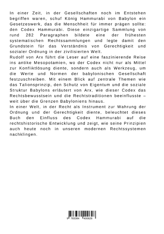 In einer Zeit, in der Gesellschaften noch im Entstehen begriffen waren, schuf König Hammurabi von Babylon ein Gesetzeswerk, das die Menschheit für immer prägen sollte: den Codex Hammurabi. Diese einzigartige Sammlung von rund 282 Paragraphen bildete eine der frühesten systematischen Rechtssammlungen und legte damit den Grundstein für das Verständnis von Gerechtigkeit und sozialer Ordnung in der zivilisierten Welt.Rudolf von Arx führt die Leser auf eine faszinierende Reise ins antike Mesopotamien, wo der Codex nicht nur als Mittel zur Konfliktlösung diente, sondern auch als Werkzeug, um die Werte und Normen der babylonischen Gesellschaft festzuschreiben. Mit einem Blick auf zentrale Themen wie das Talionsprinzip, den Schutz von Eigentum und die soziale Struktur Babylons erläutert von Arx, wie dieser Codex das Rechtsbewusstsein und die Rechtstraditionen beeinflusste - weit über die Grenzen Babyloniens hinaus.In einer Welt, in der Recht als Instrument zur Wahrung der Ordnung und der Gerechtigkeit diente, beleuchtet dieses Buch den Einfluss des Codex Hammurabi auf die rechtshistorische Entwicklung und zeigt, wie seine Prinzipien auch heute noch in unseren modernen Rechtssystemen nachklingen.
