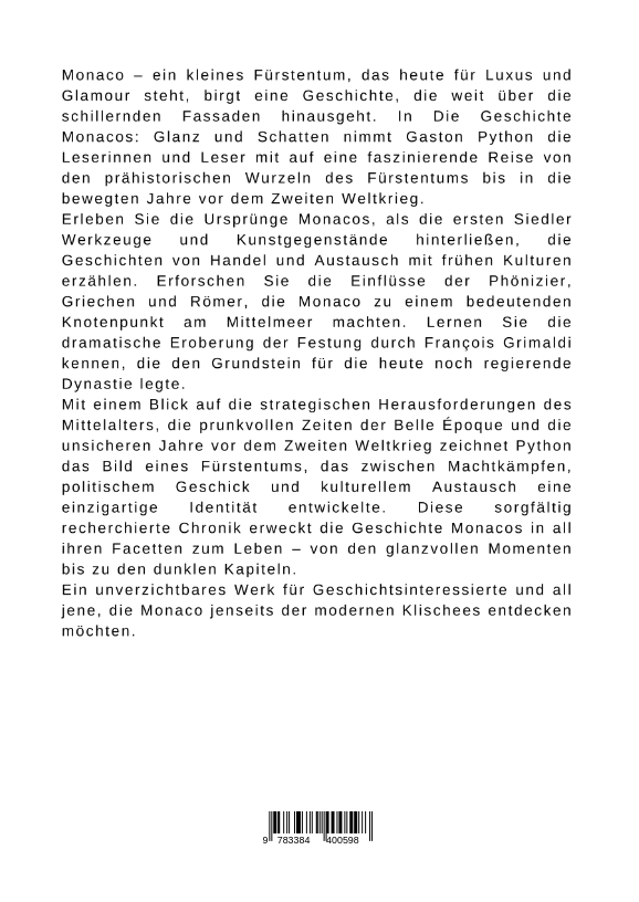 Monaco - ein kleines Fürstentum, das heute für Luxus und Glamour steht, birgt eine Geschichte, die weit über die schillernden Fassaden hinausgeht. In Die Geschichte Monacos: Glanz und Schatten nimmt Gaston Python die Leserinnen und Leser mit auf eine faszinierende Reise von den prähistorischen Wurzeln des Fürstentums bis in die bewegten Jahre vor dem Zweiten Weltkrieg.Erleben Sie die Ursprünge Monacos, als die ersten Siedler Werkzeuge und Kunstgegenstände hinterließen, die Geschichten von Handel und Austausch mit frühen Kulturen erzählen. Erforschen Sie die Einflüsse der Phönizier, Griechen und Römer, die Monaco zu einem bedeutenden Knotenpunkt am Mittelmeer machten. Lernen Sie die dramatische Eroberung der Festung durch François Grimaldi kennen, die den Grundstein für die heute noch regierende Dynastie legte.Mit einem Blick auf die strategischen Herausforderungen des Mittelalters, die prunkvollen Zeiten der Belle Époque und die unsicheren Jahre vor dem Zweiten Weltkrieg zeichnet Python das Bild eines Fürstentums, das zwischen Machtkämpfen, politischem Geschick und kulturellem Austausch eine einzigartige Identität entwickelte. Diese sorgfältig recherchierte Chronik erweckt die Geschichte Monacos in all ihren Facetten zum Leben - von den glanzvollen Momenten bis zu den dunklen Kapiteln.Ein unverzichtbares Werk für Geschichtsinteressierte und all jene, die Monaco jenseits der modernen Klischees entdecken möchten.
