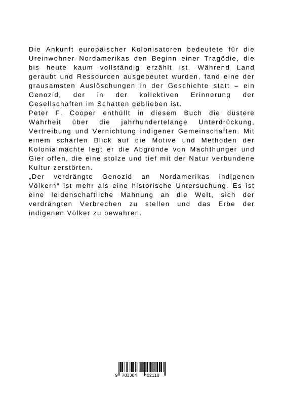 Die Ankunft europäischer Kolonisatoren bedeutete für die Ureinwohner Nordamerikas den Beginn einer Tragödie, die bis heute kaum vollständig erzählt ist. Während Land geraubt und Ressourcen ausgebeutet wurden, fand eine der grausamsten Auslöschungen in der Geschichte statt - ein Genozid, der in der kollektiven Erinnerung der Gesellschaften im Schatten geblieben ist.Peter F. Cooper enthüllt in diesem Buch die düstere Wahrheit über die jahrhundertelange Unterdrückung, Vertreibung und Vernichtung indigener Gemeinschaften. Mit einem scharfen Blick auf die Motive und Methoden der Kolonialmächte legt er die Abgründe von Machthunger und Gier offen, die eine stolze und tief mit der Natur verbundene Kultur zerstörten."Der verdrängte Genozid an Nordamerikas indigenen Völkern" ist mehr als eine historische Untersuchung. Es ist eine leidenschaftliche Mahnung an die Welt, sich der verdrängten Verbrechen zu stellen und das Erbe der indigenen Völker zu bewahren.