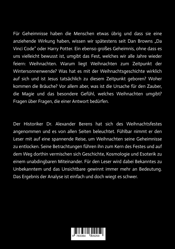 Der Historiker Dr. Alexander Berens hat sich des Weihnachtsfestes angenommen und es von allen Seiten beleuchtet. Fühlbar nimmt er den Leser mit auf eine spannende Reise, um Weihnachten seine Geheimnisse zu entlocken. Seine Betrachtungen führen ihn zum Kern des Festes und auf dem Weg dorthin vermischen sich Geschichte, Kosmologie und Esoterik zu einem unabdingbaren Miteinander. Für den Leser wird dabei Bekanntes zu Unbekanntem und das Unsichtbare gewinnt immer mehr an Bedeutung. Das Ergebnis der Analyse ist einfach und doch wiegt es schwer.