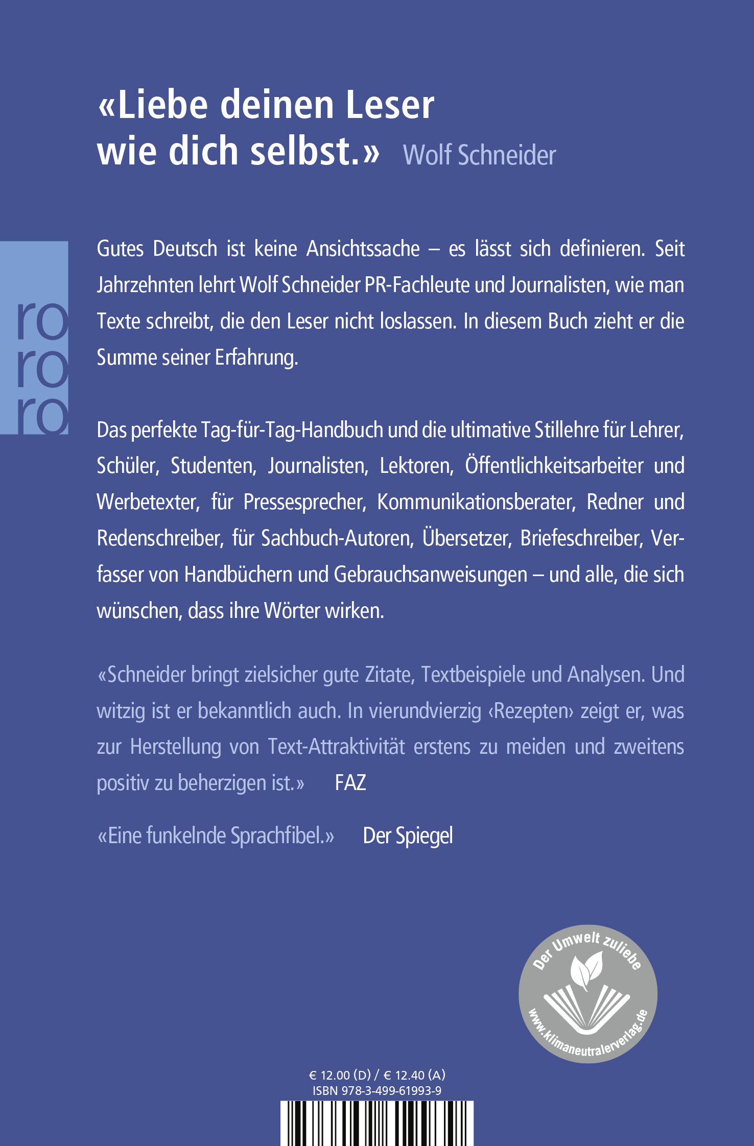 «Schneider bringt zielsicher gute Zitate, Textbeispiele und Analysen. Und witzig ist er bekanntlich auch. In vierundvierzig 'Rezepten' zeigt er, was zur Herstellung von Text-Attraktivität erstens zu meiden und zweitens positiv zu beherzigen ist.» FAZ