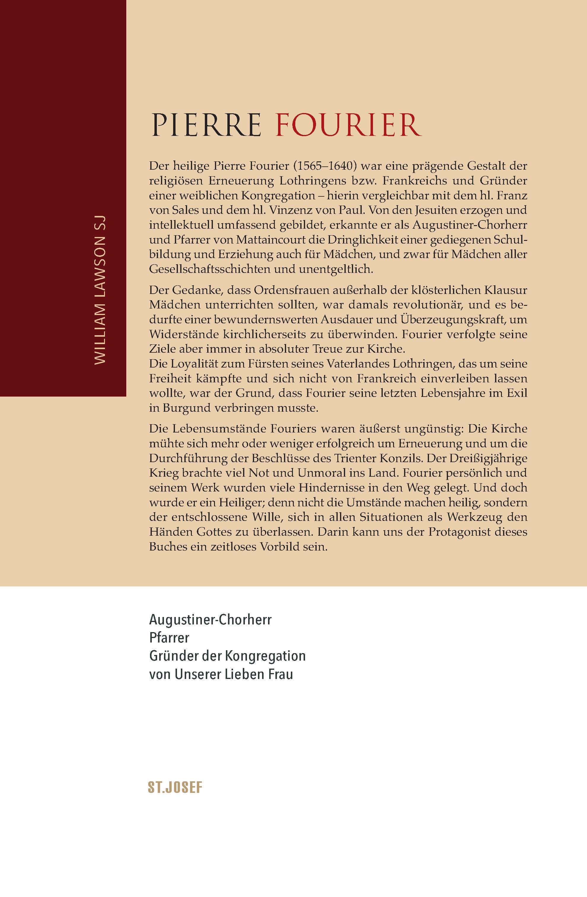 Die Lebensumstände Fouriers waren äußerst ungünstig: Die Kirche mühte sich mehr oder weniger erfolgreich um Erneuerung und um die Durchführung der Beschlüsse des Trienter Konzils. Der Dreißigjährige Krieg brachte viel Not und Unmoral ins Land. Fourier persönlich und seinem Werk wurden viele Hindernisse in den Weg gelegt. Und doch wurde er ein Heiliger; denn nicht die Umstände machen heilig, sondern der entschlossene Wille, sich in allen Situationen als Werkzeug den Händen Gottes zu überlassen. Darin kann uns der Protagonist dieses Buches ein zeitloses Vorbild sein.