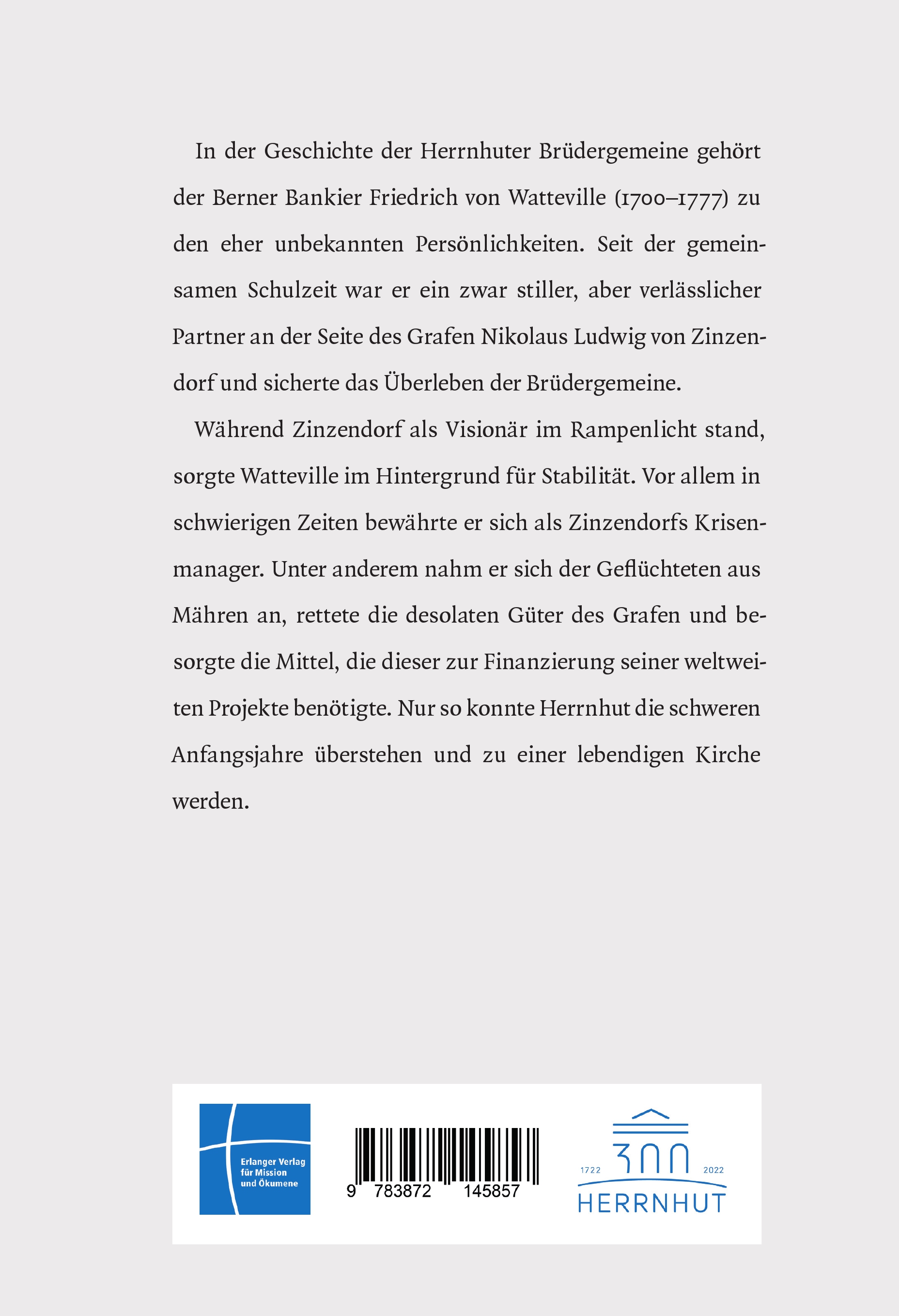 In der Geschichte der Herrnhuter Brüdergemeine gehört der Berner Bankier Friedrich von Watteville (1700–1777) zu den eher unbekannten Persönlichkeiten. Seit der gemeinsamen Schulzeit war er ein zwar stiller, aber verlässlicher Partner an der Seite des Grafen Nikolaus Ludwig von Zinzendorf und sicherte das Überleben der Brüdergemeine.