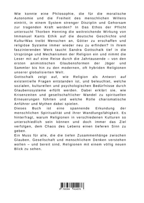 Was treibt Menschen an, Götter zu erschaffen und religiöse Systeme immer wieder neu zu erfinden? In ihrem faszinierenden Werk taucht Sandra Gottschalk tief in die Ursprünge und Mechanismen der Religion ein und nimmt die Leser mit auf eine Reise durch die Jahrtausende - von den ersten animistischen Glaubensformen der Jäger und Sammler bis hin zu den modernen, oft hybriden Religionen unserer globalisierten Welt.Gottschalk zeigt auf, wie Religion als Antwort auf existentielle Fragen entstanden ist, und beleuchtet, welche sozialen, kulturellen und psychologischen Bedürfnisse durch Glaubenssysteme erfüllt werden. Dabei erklärt sie, wie Krisenzeiten und gesellschaftlicher Wandel zu spirituellen Erneuerungen führten und welche Rolle charismatische Anführer und Mythen dabei spielen.Dieses Buch ist eine spannende Erkundung der menschlichen Spiritualität und ihrer Wandlungsfähigkeit. Es hinterfragt, warum Religionen in verschiedenen Kulturen so unterschiedlich sein können und doch immer das Ziel verfolgen, dem Chaos des Lebens einen tieferen Sinn zu geben.Ein Muss für alle, die die tiefen Zusammenhänge zwischen Glauben, Gesellschaft und menschlichem Denken verstehen wollen - und bereit sind, Religionen mit einem völlig neuen Blick zu sehen.