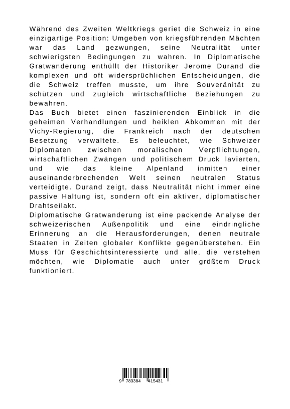 Während des Zweiten Weltkriegs geriet die Schweiz in eine einzigartige Position: Umgeben von kriegsführenden Mächten war das Land gezwungen, seine Neutralität unter schwierigsten Bedingungen zu wahren. In Diplomatische Gratwanderung enthüllt der Historiker Jerome Durand die komplexen und oft widersprüchlichen Entscheidungen, die die Schweiz treffen musste, um ihre Souveränität zu schützen und zugleich wirtschaftliche Beziehungen zu bewahren.Das Buch bietet einen faszinierenden Einblick in die geheimen Verhandlungen und heiklen Abkommen mit der Vichy-Regierung, die Frankreich nach der deutschen Besetzung verwaltete. Es beleuchtet, wie Schweizer Diplomaten zwischen moralischen Verpflichtungen, wirtschaftlichen Zwängen und politischem Druck lavierten, und wie das kleine Alpenland inmitten einer auseinanderbrechenden Welt seinen neutralen Status verteidigte. Durand zeigt, dass Neutralität nicht immer eine passive Haltung ist, sondern oft ein aktiver, diplomatischer Drahtseilakt.Diplomatische Gratwanderung ist eine packende Analyse der schweizerischen Außenpolitik und eine eindringliche Erinnerung an die Herausforderungen, denen neutrale Staaten in Zeiten globaler Konflikte gegenüberstehen. Ein Muss für Geschichtsinteressierte und alle, die verstehen möchten, wie Diplomatie auch unter größtem Druck funktioniert.
