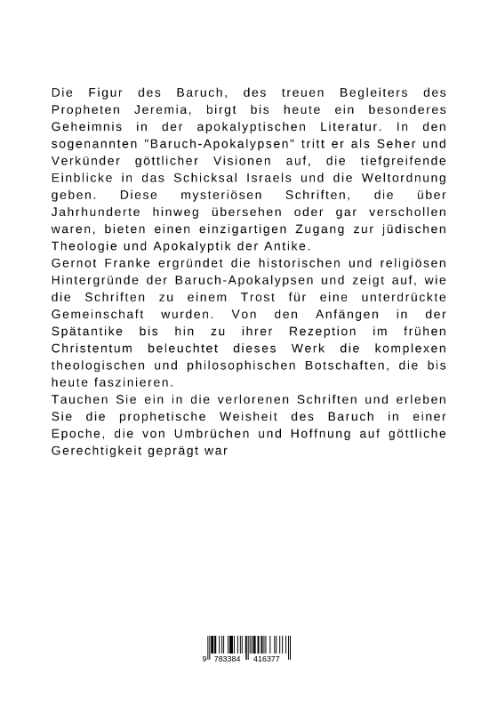 Die Figur des Baruch, des treuen Begleiters des Propheten Jeremia, birgt bis heute ein besonderes Geheimnis in der apokalyptischen Literatur. In den sogenannten "Baruch-Apokalypsen" tritt er als Seher und Verkünder göttlicher Visionen auf, die tiefgreifende Einblicke in das Schicksal Israels und die Weltordnung geben. Diese mysteriösen Schriften, die über Jahrhunderte hinweg übersehen oder gar verschollen waren, bieten einen einzigartigen Zugang zur jüdischen Theologie und Apokalyptik der Antike.Gernot Franke ergründet die historischen und religiösen Hintergründe der Baruch-Apokalypsen und zeigt auf, wie die Schriften zu einem Trost für eine unterdrückte Gemeinschaft wurden. Von den Anfängen in der Spätantike bis hin zu ihrer Rezeption im frühen Christentum beleuchtet dieses Werk die komplexen theologischen und philosophischen Botschaften, die bis heute faszinieren.Tauchen Sie ein in die verlorenen Schriften und erleben Sie die prophetische Weisheit des Baruch in einer Epoche, die von Umbrüchen und Hoffnung auf göttliche Gerechtigkeit geprägt war.