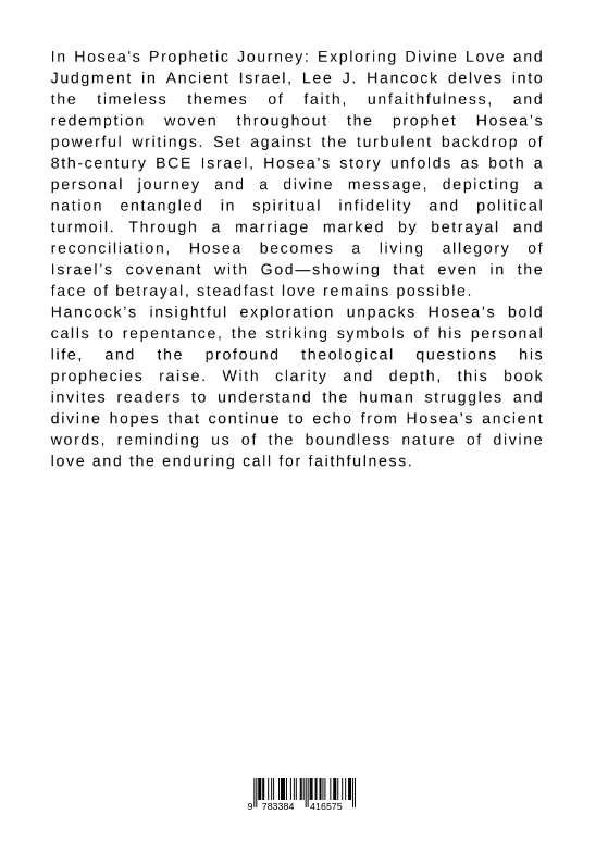 In Hosea's Prophetic Journey: Exploring Divine Love and Judgment in Ancient Israel, Lee J. Hancock delves into the timeless themes of faith, unfaithfulness, and redemption woven throughout the prophet Hosea's powerful writings. Set against the turbulent backdrop of 8th-century BCE Israel, Hosea's story unfolds as both a personal journey and a divine message, depicting a nation entangled in spiritual infidelity and political turmoil. Through a marriage marked by betrayal and reconciliation, Hosea becomes a living allegory of Israel's covenant with God-showing that even in the face of betrayal, steadfast love remains possible.Hancock's insightful exploration unpacks Hosea's bold calls to repentance, the striking symbols of his personal life, and the profound theological questions his prophecies raise. With clarity and depth, this book invites readers to understand the human struggles and divine hopes that continue to echo from Hosea's ancient words, reminding us of the boundless nature of divine love and the enduring call for faithfulness.