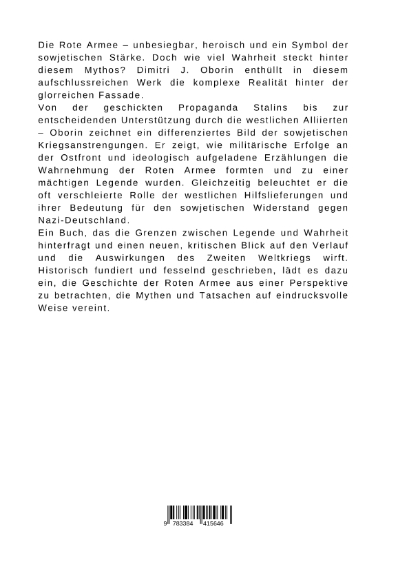 Die Rote Armee - unbesiegbar, heroisch und ein Symbol der sowjetischen Stärke. Doch wie viel Wahrheit steckt hinter diesem Mythos? Dimitri J. Oborin enthüllt in diesem aufschlussreichen Werk die komplexe Realität hinter der glorreichen Fassade.Von der geschickten Propaganda Stalins bis zur entscheidenden Unterstützung durch die westlichen Alliierten - Oborin zeichnet ein differenziertes Bild der sowjetischen Kriegsanstrengungen. Er zeigt, wie militärische Erfolge an der Ostfront und ideologisch aufgeladene Erzählungen die Wahrnehmung der Roten Armee formten und zu einer mächtigen Legende wurden. Gleichzeitig beleuchtet er die oft verschleierte Rolle der westlichen Hilfslieferungen und ihrer Bedeutung für den sowjetischen Widerstand gegen Nazi-Deutschland.Ein Buch, das die Grenzen zwischen Legende und Wahrheit hinterfragt und einen neuen, kritischen Blick auf den Verlauf und die Auswirkungen des Zweiten Weltkriegs wirft. Historisch fundiert und fesselnd geschrieben, lädt es dazu ein, die Geschichte der Roten Armee aus einer Perspektive zu betrachten, die Mythen und Tatsachen auf eindrucksvolle Weise vereint.