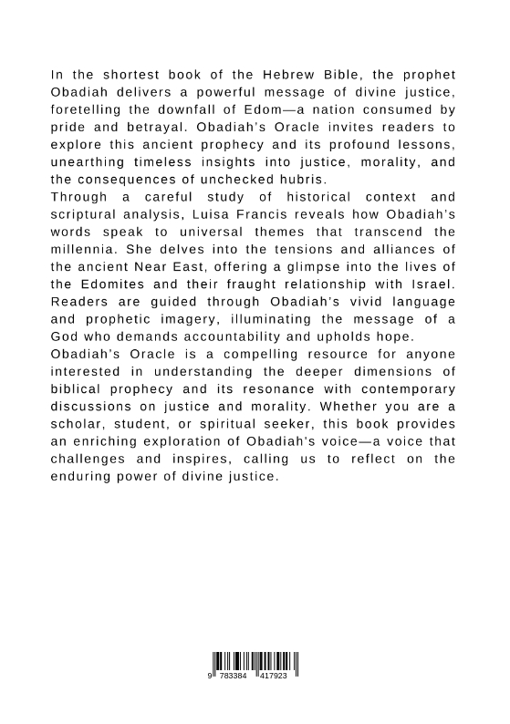 In the shortest book of the Hebrew Bible, the prophet Obadiah delivers a powerful message of divine justice, foretelling the downfall of Edom-a nation consumed by pride and betrayal. Obadiah's Oracle invites readers to explore this ancient prophecy and its profound lessons, unearthing timeless insights into justice, morality, and the consequences of unchecked hubris.Through a careful study of historical context and scriptural analysis, Luisa Francis reveals how Obadiah's words speak to universal themes that transcend the millennia. She delves into the tensions and alliances of the ancient Near East, offering a glimpse into the lives of the Edomites and their fraught relationship with Israel. Readers are guided through Obadiah's vivid language and prophetic imagery, illuminating the message of a God who demands accountability and upholds hope.Obadiah's Oracle is a compelling resource for anyone interested in understanding the deeper dimensions of biblical prophecy and its resonance with contemporary discussions on justice and morality. Whether you are a scholar, student, or spiritual seeker, this book provides an enriching exploration of Obadiah's voice-a voice that challenges and inspires, calling us to reflect on the enduring power of divine justice.