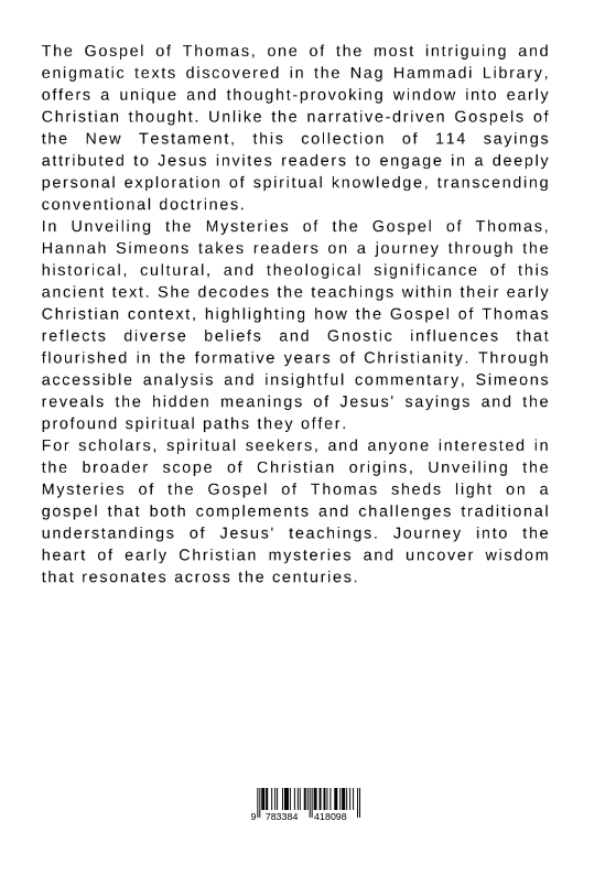 The Gospel of Thomas, one of the most intriguing and enigmatic texts discovered in the Nag Hammadi Library, offers a unique and thought-provoking window into early Christian thought. Unlike the narrative-driven Gospels of the New Testament, this collection of 114 sayings attributed to Jesus invites readers to engage in a deeply personal exploration of spiritual knowledge, transcending conventional doctrines.In Unveiling the Mysteries of the Gospel of Thomas, Hannah Simeons takes readers on a journey through the historical, cultural, and theological significance of this ancient text. She decodes the teachings within their early Christian context, highlighting how the Gospel of Thomas reflects diverse beliefs and Gnostic influences that flourished in the formative years of Christianity. Through accessible analysis and insightful commentary, Simeons reveals the hidden meanings of Jesus' sayings and the profound spiritual paths they offer.For scholars, spiritual seekers, and anyone interested in the broader scope of Christian origins, Unveiling the Mysteries of the Gospel of Thomas sheds light on a gospel that both complements and challenges traditional understandings of Jesus' teachings. Journey into the heart of early Christian mysteries and uncover wisdom that resonates across the centuries.