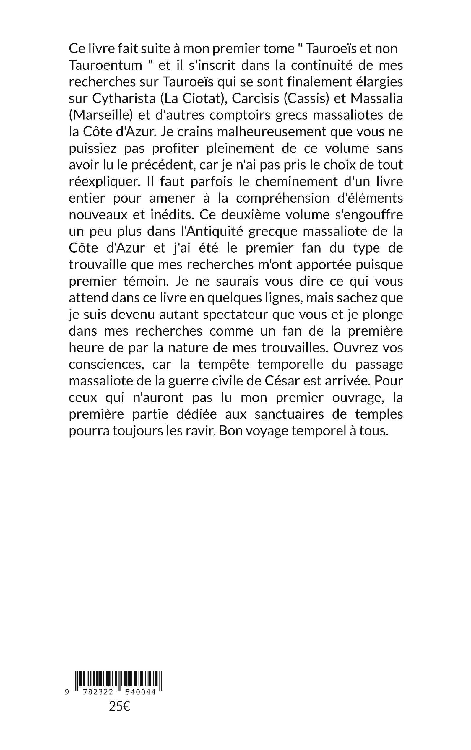 Ce livre fait suite à mon premier tome " Tauroeïs et non Tauroentum " et il s'inscrit dans la continuité de mes recherches sur Tauroeïs qui se sont finalement élargies sur Cytharista (La Ciotat), Carcisis (Cassis) et Massalia (Marseille) et d'autres comptoirs grecs massaliotes de la Côte d'Azur.