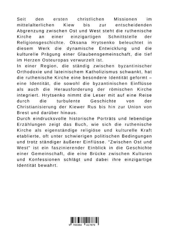 Seit den ersten christlichen Missionen im mittelalterlichen Kiew bis zur entscheidenden Abgrenzung zwischen Ost und West steht die ruthenische Kirche an einer einzigartigen Schnittstelle der Religionsgeschichte. Oksana Hrytsenko beleuchtet in diesem Werk die dynamische Entwicklung und die kulturelle Prägung einer Glaubensgemeinschaft, die tief im Herzen Osteuropas verwurzelt ist.In einer Region, die ständig zwischen byzantinischer Orthodoxie und lateinischem Katholizismus schwankt, hat die ruthenische Kirche eine besondere Identität geformt - eine Identität, die sowohl die byzantinischen Einflüsse als auch die Herausforderung der römischen Kirche integriert. Hrytsenko nimmt die Leser mit auf eine Reise durch die turbulente Geschichte von der Christianisierung der Kiewer Rus bis hin zur Union von Brest und darüber hinaus.Durch eindrucksvolle historische Porträts und lebendige Erzählungen zeigt das Buch, wie sich die ruthenische Kirche als eigenständige religiöse und kulturelle Kraft etablierte, oft unter schwierigen politischen Bedingungen und trotz ständiger äußerer Einflüsse. "Zwischen Ost und West" ist ein faszinierender Einblick in die Geschichte einer Gemeinschaft, die eine Brücke zwischen Kulturen und Konfessionen schlägt und dabei ihre einzigartige Identität bewahrt.Dieser Text vermittelt die zentralen Themen und historische Bedeutung der ruthenischen Kirche und spricht Leser an, die sich für die Schnittstellen zwischen Religion, Kultur und Geschichte interessieren.