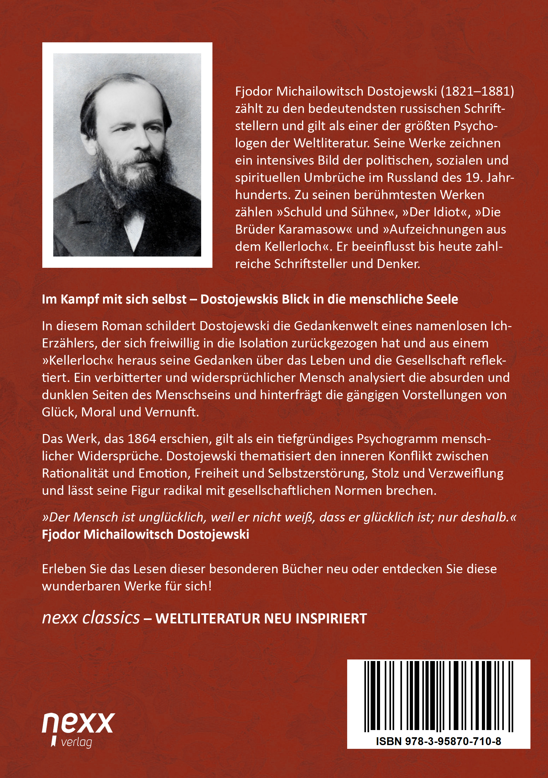 In diesem Roman schildert Dostojewski die Gedankenwelt eines namenlosen Ich-Erzählers, der sich freiwillig in die Isolation zurückgezogen hat und aus einem »Kellerloch« heraus seine Gedanken über das Leben und die Gesellschaft reflektiert. Ein verbitterter und widersprüchlicher Mensch analysiert die absurden und dunklen Seiten des Menschseins und hinterfrägt die gängigen Vorstellungen von Glück, Moral und Vernunft.