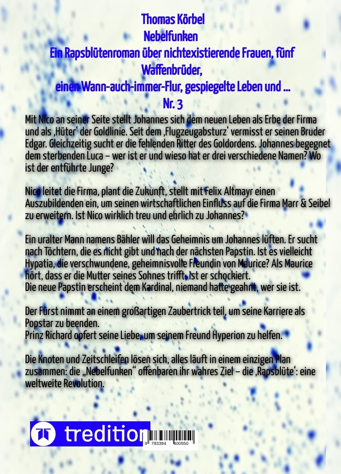 Mit Nico an seiner Seite stellt Johannes sich dem neuen Leben als Erbe der Firma und als 'Hüter' der Goldlinie. Seit dem 'Flugzeugabsturz' vermisst er seinen Bruder Edgar. Gleichzeitig sucht er die fehlenden Ritter des Goldordens. Johannes begegnet dem sterbenden Luca - wer ist er und wieso hat er drei verschiedene Namen? Wo ist der entführte Junge? Nico leitet die Firma, plant die Zukunft, stellt mit Felix Altmayr einen Auszubildenden ein, um seinen wirtschaftlichen Einfluss auf die Firma Marr & Seibel zu erweitern. Ist Nico wirklich treu und ehrlich zu Johannes? Ein ur-alter Mann namens Bähler will das Geheimnis um Johannes lüften. Er sucht nach Töchtern, die es nicht gibt und nach der nächsten Papstin. Ist es vielleicht Hypatia, die verschwundene, geheimnisvolle Freundin von Maurice? Als Maurice hört, dass er die Mutter seines Sohnes trifft, ist er schockiert. Die neue Papstin erscheint dem Kardinal, niemand hatte geahnt, wer sie ist.Der Fürst nimmt an einem großartigen Zaubertrick teil, um seine Karriere als Popstar zu beenden. Prinz Richard opfert seine Liebe, um seinem Freund Hyperion zu helfen. Die Knoten und Zeitschleifen lösen sich, alles läuft in einem einzigen Plan zusammen: die "Nebelfunken" offenbaren ihr wahres Ziel - die 'Rapsblüte': eine weltweite Revolution.