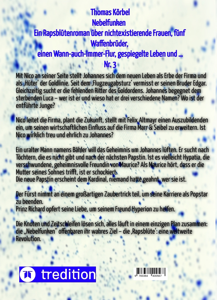 Mit Nico an seiner Seite stellt Johannes sich dem neuen Leben als Erbe der Firma und als 'Hüter' der Goldlinie. Seit dem 'Flugzeugabsturz' vermisst er seinen Bruder Edgar. Gleichzeitig sucht er die fehlenden Ritter des Goldordens. Johannes begegnet dem sterbenden Luca - wer ist er und wieso hat er drei verschiedene Namen? Wo ist der entführte Junge? Nico leitet die Firma, plant die Zukunft, stellt mit Felix Altmayr einen Auszubildenden ein, um seinen wirtschaftlichen Einfluss auf die Firma Marr & Seibel zu erweitern. Ist Nico wirklich treu und ehrlich zu Johannes? Ein ur-alter Mann namens Bähler will das Geheimnis um Johannes lüften. Er sucht nach Töchtern, die es nicht gibt und nach der nächsten Papstin. Ist es vielleicht Hypatia, die verschwundene, geheimnisvolle Freundin von Maurice? Als Maurice hört, dass er die Mutter seines Sohnes trifft, ist er schockiert. Die neue Papstin erscheint dem Kardinal, niemand hatte geahnt, wer sie ist.Der Fürst nimmt an einem großartigen Zaubertrick teil, um seine Karriere als Popstar zu beenden. Prinz Richard opfert seine Liebe, um seinem Freund Hyperion zu helfen. Die Knoten und Zeitschleifen lösen sich, alles läuft in einem einzigen Plan zusammen: die "Nebelfunken" offenbaren ihr wahres Ziel - die 'Rapsblüte': eine weltweite Revolution.