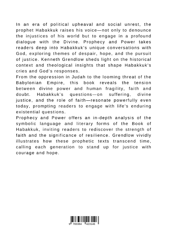 In an era of political upheaval and social unrest, the prophet Habakkuk raises his voice-not only to denounce the injustices of his world but to engage in a profound dialogue with the Divine. Prophecy and Power takes readers deep into Habakkuk's unique conversations with God, exploring themes of despair, hope, and the pursuit of justice. Kenneth Grendlow sheds light on the historical context and theological insights that shape Habakkuk's cries and God's responses.From the oppression in Judah to the looming threat of the Babylonian Empire, this book reveals the tension between divine power and human fragility, faith and doubt. Habakkuk's questions-on suffering, divine justice, and the role of faith-resonate powerfully even today, prompting readers to engage with life's enduring existential questions.Prophecy and Power offers an in-depth analysis of the symbolic language and literary forms of the Book of Habakkuk, inviting readers to rediscover the strength of faith and the significance of resilience. Grendlow vividly illustrates how these prophetic texts transcend time, calling each generation to stand up for justice with courage and hope.