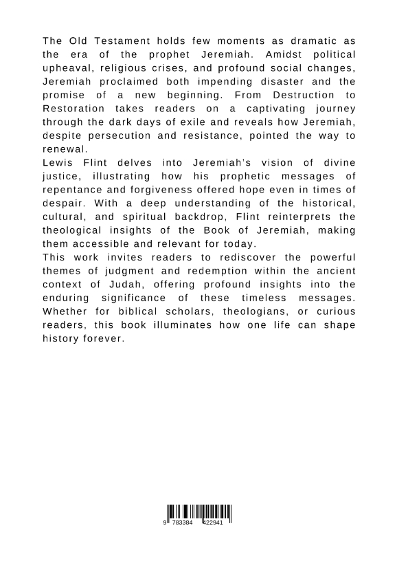 The Old Testament holds few moments as dramatic as the era of the prophet Jeremiah. Amidst political upheaval, religious crises, and profound social changes, Jeremiah proclaimed both impending disaster and the promise of a new beginning. From Destruction to Restoration takes readers on a captivating journey through the dark days of exile and reveals how Jeremiah, despite persecution and resistance, pointed the way to renewal.Lewis Flint delves into Jeremiah's vision of divine justice, illustrating how his prophetic messages of repentance and forgiveness offered hope even in times of despair. With a deep understanding of the historical, cultural, and spiritual backdrop, Flint reinterprets the theological insights of the Book of Jeremiah, making them accessible and relevant for today.This work invites readers to rediscover the powerful themes of judgment and redemption within the ancient context of Judah, offering profound insights into the enduring significance of these timeless messages. Whether for biblical scholars, theologians, or curious readers, this book illuminates how one life can shape history forever.