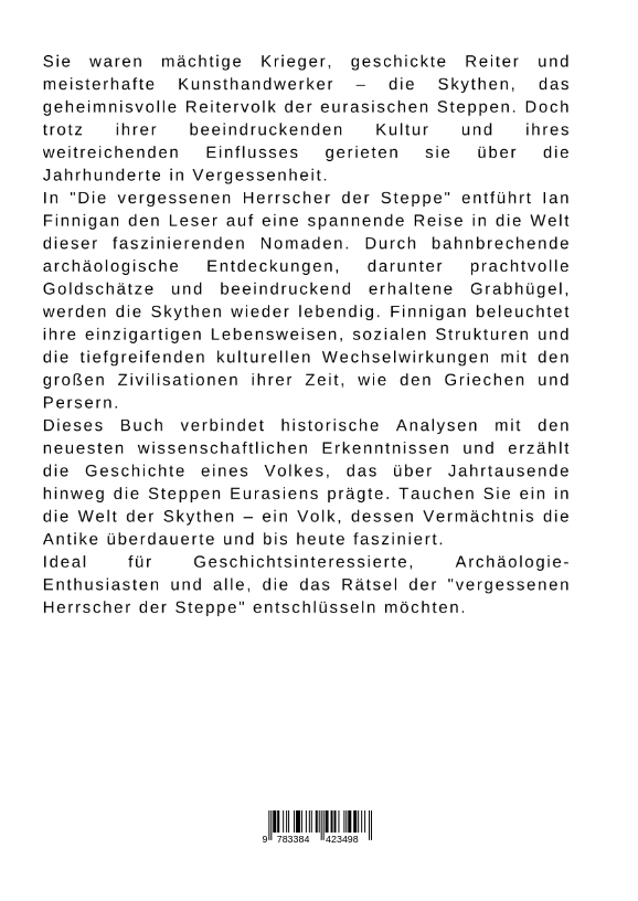 Sie waren mächtige Krieger, geschickte Reiter und meisterhafte Kunsthandwerker - die Skythen, das geheimnisvolle Reitervolk der eurasischen Steppen. Doch trotz ihrer beeindruckenden Kultur und ihres weitreichenden Einflusses gerieten sie über die Jahrhunderte in Vergessenheit.In "Die vergessenen Herrscher der Steppe" entführt Ian Finnigan den Leser auf eine spannende Reise in die Welt dieser faszinierenden Nomaden. Durch bahnbrechende archäologische Entdeckungen, darunter prachtvolle Goldschätze und beeindruckend erhaltene Grabhügel, werden die Skythen wieder lebendig. Finnigan beleuchtet ihre einzigartigen Lebensweisen, sozialen Strukturen und die tiefgreifenden kulturellen Wechselwirkungen mit den großen Zivilisationen ihrer Zeit, wie den Griechen und Persern.Dieses Buch verbindet historische Analysen mit den neuesten wissenschaftlichen Erkenntnissen und erzählt die Geschichte eines Volkes, das über Jahrtausende hinweg die Steppen Eurasiens prägte. Tauchen Sie ein in die Welt der Skythen - ein Volk, dessen Vermächtnis die Antike überdauerte und bis heute fasziniert.