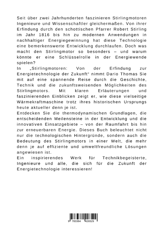 Seit über zwei Jahrhunderten faszinieren Stirlingmotoren Ingenieure und Wissenschaftler gleichermaßen. Von ihrer Erfindung durch den schottischen Pfarrer Robert Stirling im Jahr 1816 bis hin zu modernen Anwendungen in nachhaltiger Energiegewinnung hat diese Technologie eine bemerkenswerte Entwicklung durchlaufen. Doch was macht den Stirlingmotor so besonders - und warum könnte er eine Schlüsselrolle in der Energiewende spielen?In "Stirlingmotoren: Von der Erfindung zur Energietechnologie der Zukunft" nimmt Dario Thomas Sie mit auf eine spannende Reise durch die Geschichte, Technik und die zukunftsweisenden Möglichkeiten des Stirlingmotors. Mit klaren Erläuterungen und faszinierenden Einblicken zeigt er, wie diese vielseitige Wärmekraftmaschine trotz ihres historischen Ursprungs heute aktueller denn je ist.Entdecken Sie die thermodynamischen Grundlagen, die entscheidenden Meilensteine in der Entwicklung und die innovativen Einsatzgebiete - von der Raumfahrt bis hin zur erneuerbaren Energie. Dieses Buch beleuchtet nicht nur die technologischen Hintergründe, sondern auch die Bedeutung des Stirlingmotors in einer Welt, die mehr denn je auf effiziente und umweltfreundliche Lösungen angewiesen ist.Ein inspirierendes Werk für Technikbegeisterte, Ingenieure und alle, die sich für die Zukunft der Energietechnologie interessieren!