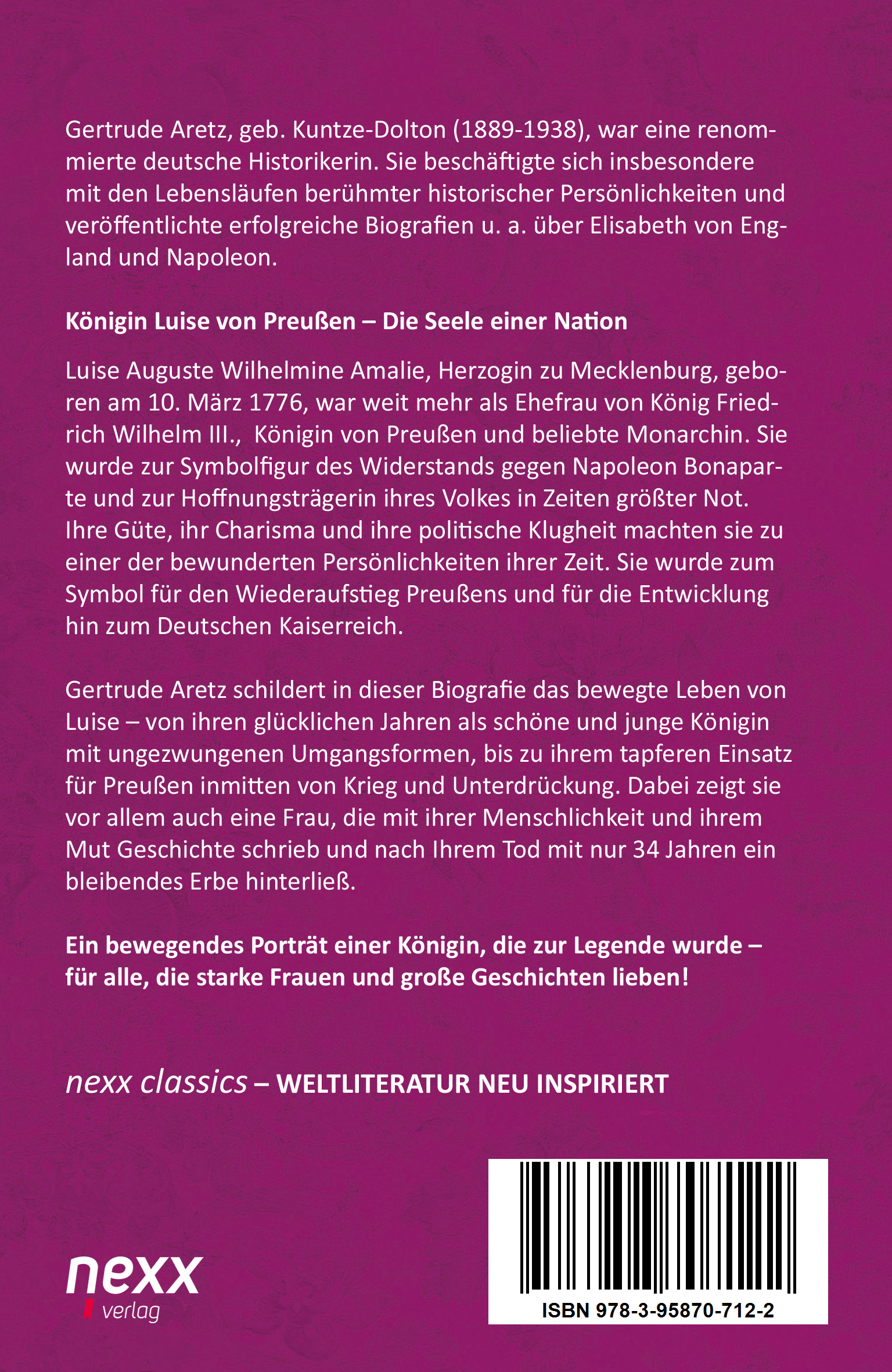 Gertrude Aretz schildert in dieser Biografie das bewegte Leben von Luise - von ihren glücklichen Jahren als schöne und junge Königin mit ungezwungenen Umgangsformen, bis zu ihrem tapferen Einsatz für Preußen inmitten von Krieg und Unterdrückung. Dabei zeigt sie vor allem auch eine Frau, die mit ihrer Menschlichkeit und ihrem Mut Geschichte schrieb und nach Ihrem Tod mit nur 34 Jahren ein bleibendes Erbe hinterließ.