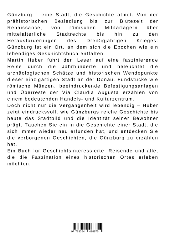 Günzburg - eine Stadt, die Geschichte atmet. Von der prähistorischen Besiedlung bis zur Blütezeit der Renaissance, von römischen Militärlagern über mittelalterliche Stadtrechte bis hin zu den Herausforderungen des Dreißigjährigen Krieges: Günzburg ist ein Ort, an dem sich die Epochen wie ein lebendiges Geschichtsbuch entfalten.Martin Huber führt den Leser auf eine faszinierende Reise durch die Jahrhunderte und beleuchtet die archäologischen Schätze und historischen Wendepunkte dieser einzigartigen Stadt an der Donau. Fundstücke wie römische Münzen, beeindruckende Befestigungsanlagen und Überreste der Via Claudia Augusta erzählen von einem bedeutenden Handels- und Kulturzentrum.Doch nicht nur die Vergangenheit wird lebendig - Huber zeigt eindrucksvoll, wie Günzburgs reiche Geschichte bis heute das Stadtbild und die Identität seiner Bewohner prägt. Tauchen Sie ein in die Geschichte einer Stadt, die sich immer wieder neu erfunden hat, und entdecken Sie die verborgenen Geschichten, die Günzburg zu erzählen hat.Ein Buch für Geschichtsinteressierte, Reisende und alle, die die Faszination eines historischen Ortes erleben möchten.